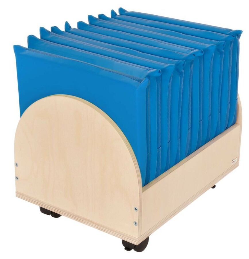 Rust in de kring en snel weer opgeruimd: 10 blauwe zitkussens met stevige opbergtrolley. De kussens zitten prettig door 3 cm schuim en blijven goed liggen dankzij een antislip onderzijde. Het kunstleer is eenvoudig af te nemen, ideaal voor groep en klas. De houten trolley rolt soepel op vier zwenkwielen met rem.
