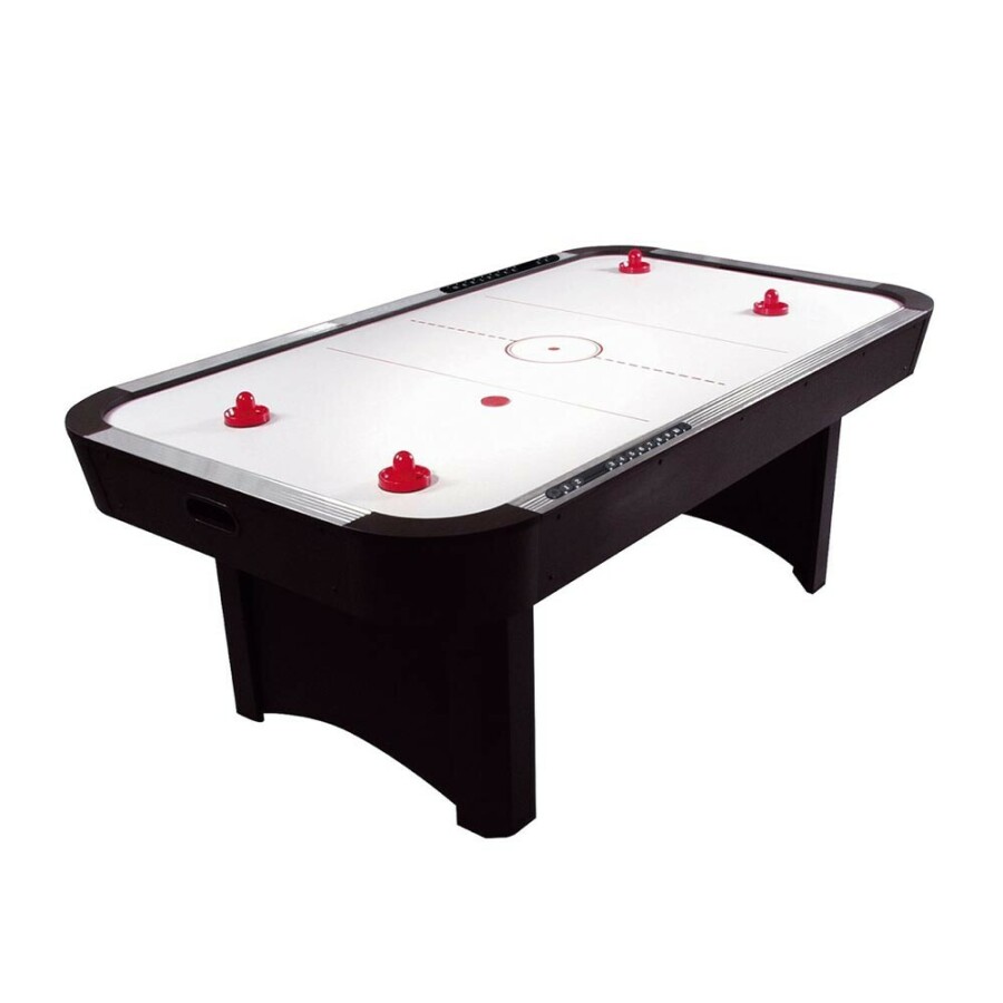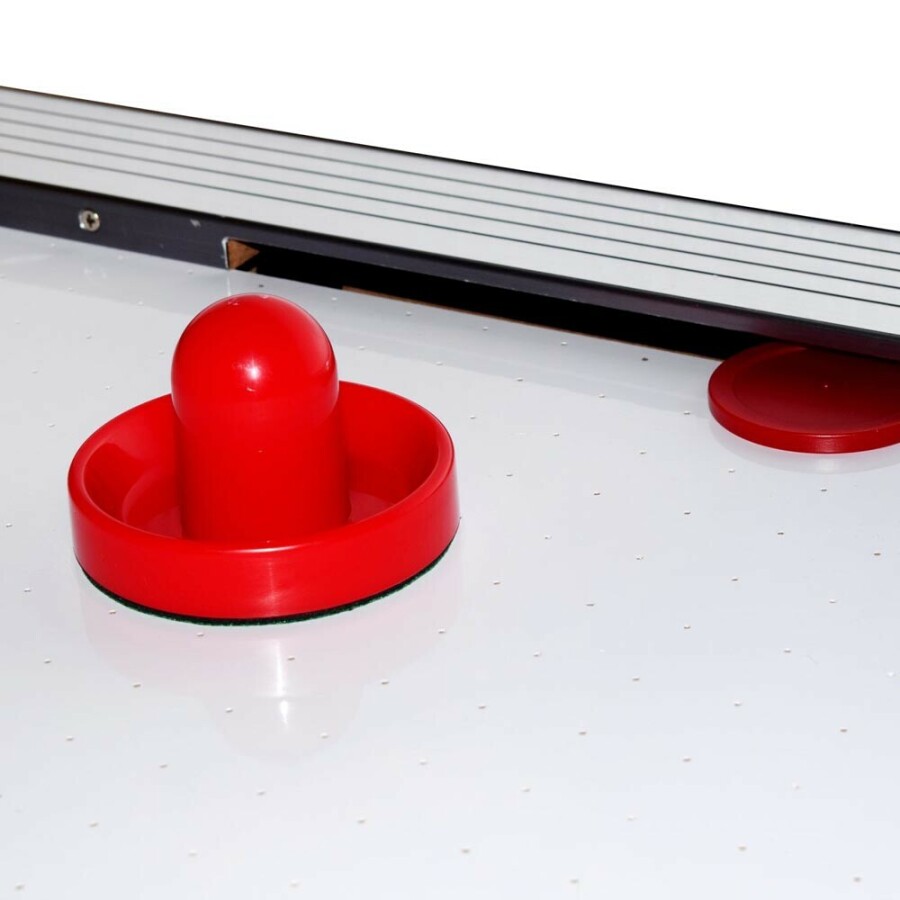 Deze stevige tafel voor lucht-hockey brengt vaart in elke speelhoek. Het witte speelvlak is hoogglans, krasvast en 32 mm dik. Door de luchtstroom glijdt de puck soepel en blijft het spel eerlijk. Je hebt een 220 V aansluiting nodig. Er worden vier rode pushers en vier pucks meegeleverd. Geschikt vanaf 6 jaar; montage is vereist. Afmetingen van de tafel maken plaats voor meerdere spelers tegelijk.