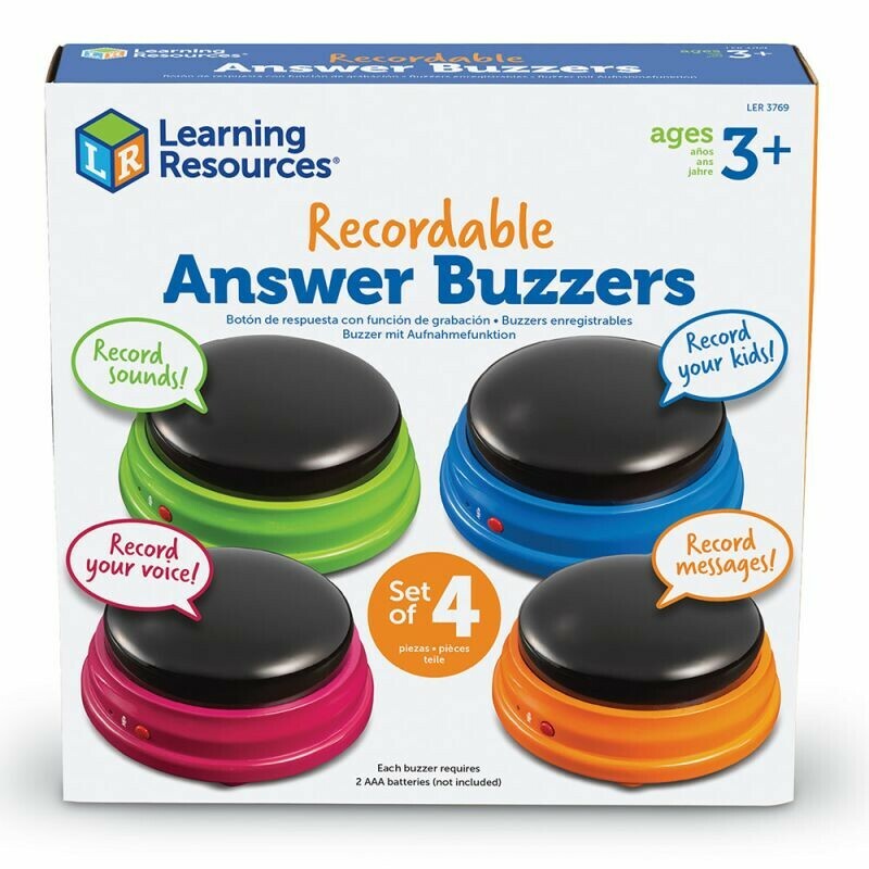 Met deze antwoordbuzzers kun je zelf je geluiden, stemmen, muziek en boodschappen opnemen. Maximale duur van een opname is 7 seconden. Alle buzzers zijn 9 cm. Per buzzer zijn 2 AAA batterijen nodig (niet inbegrepen).