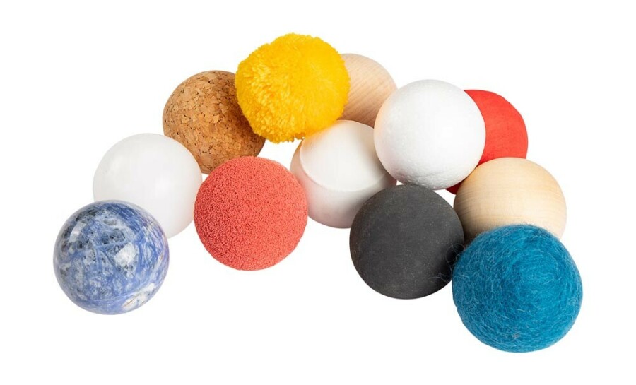 - 12 ballen Ø 4 cm: piepschuim, was, steen, rubber, foam, kurk, papier, beuken, linde, wolpompon, vilt, porselein