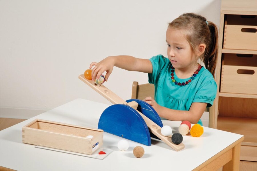 Wegen, voelen en vergelijken: deze set maakt materiaaleigenschappen tastbaar. Kinderen schatten eerst, leggen dan de ballen op de balkweegschaal en zien het resultaat. Zo leren ze over gewicht, dichtheid, textuur en woorden als lichter en zwaarder. Alles netjes opgeborgen in de houten doos met schuifdeksel.