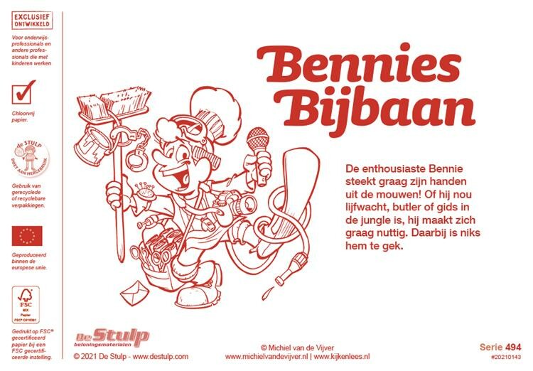 Beloningsstickers van het karakter Bennie. Bennie is de hoofdpersoon uit een reeks boeken van de Kijk- en Leesseries. De enthousiaste Bennie steekt graag zijn handen uit de mouwen! Of hij nou lijfwacht, butler of gids in de jungle is, hij maakt zich graag nuttig. Daarbij is niks hem te gek. Bennie maakt zo kennis met verschillende beroepen.
