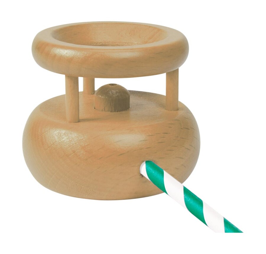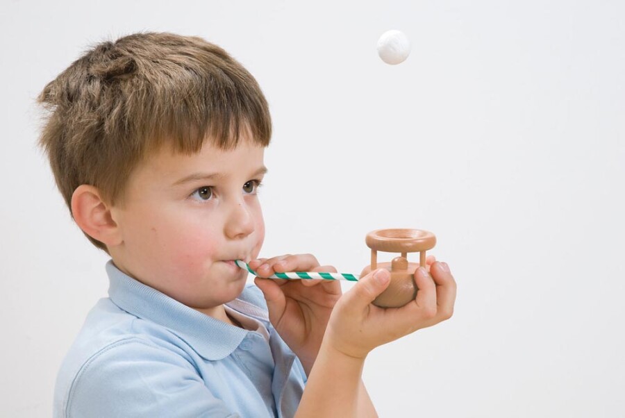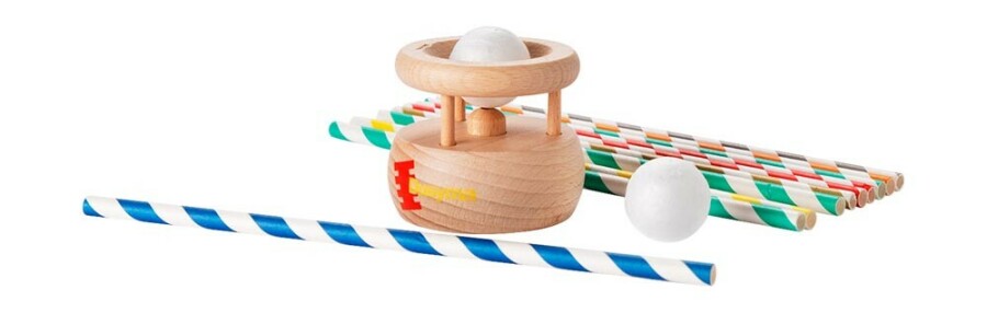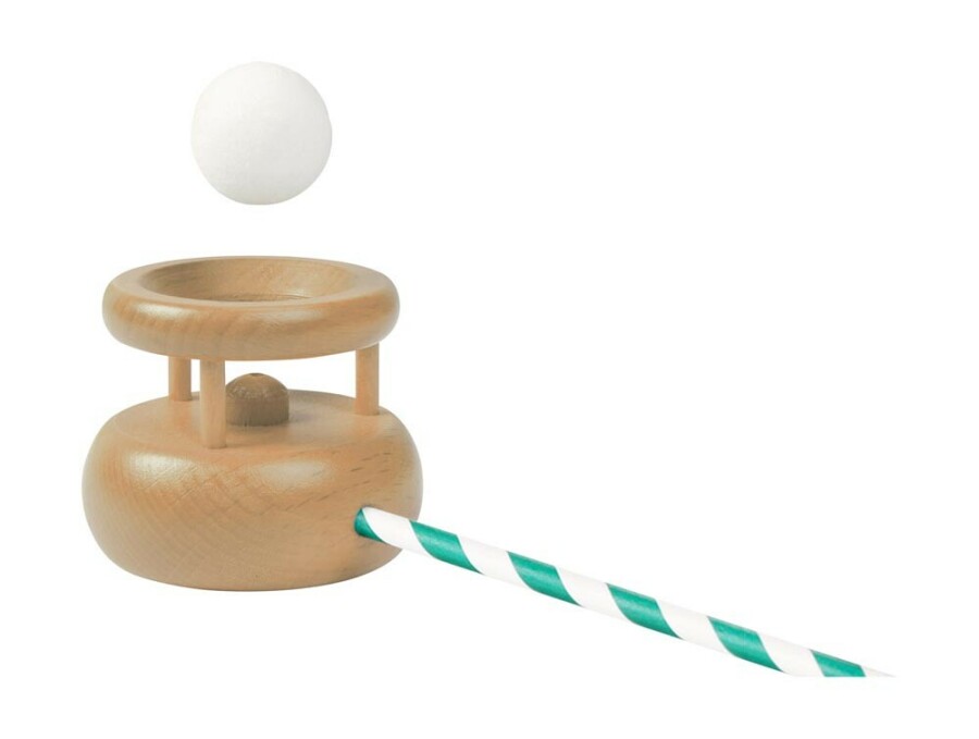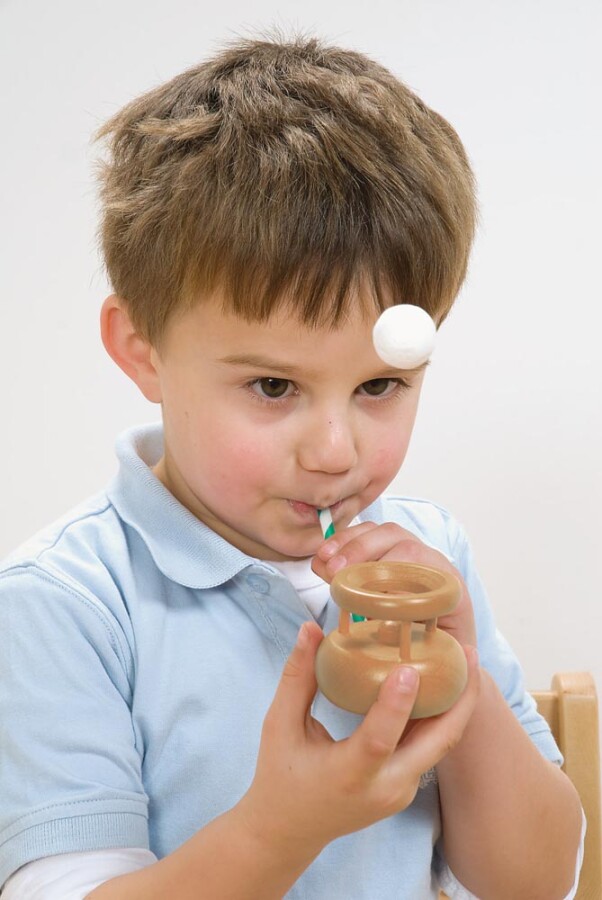 Met een rietje blaas je het lichte balletje dansend in de lucht. Een vrolijke adem- en mondmotoriekoefening voor therapie, kleuterklas en thuis. Concentratie, timing en ademcontrole komen spelenderwijs aan bod. Het houten cupje ligt stabiel in de hand. Papieren rietjes maken het spel hygiënisch in groepen.