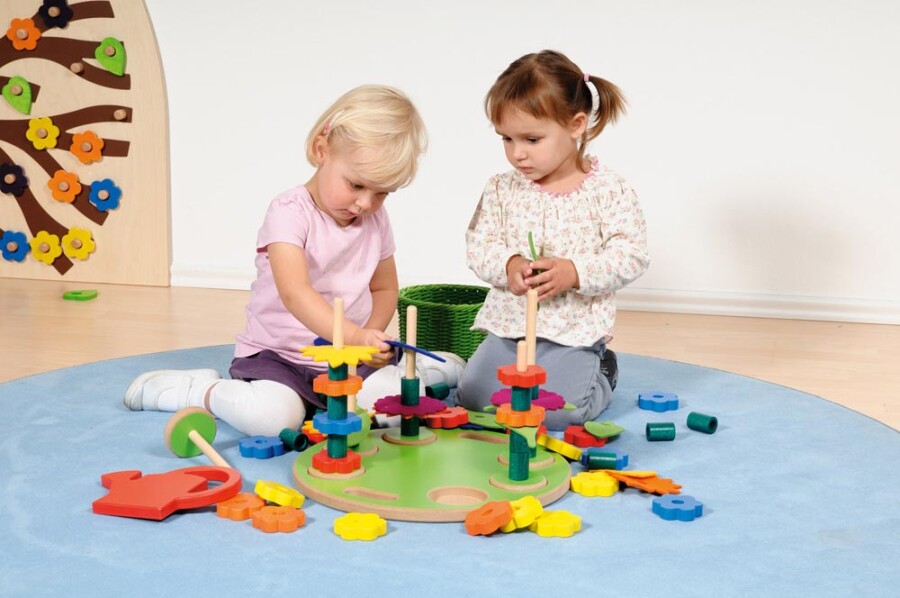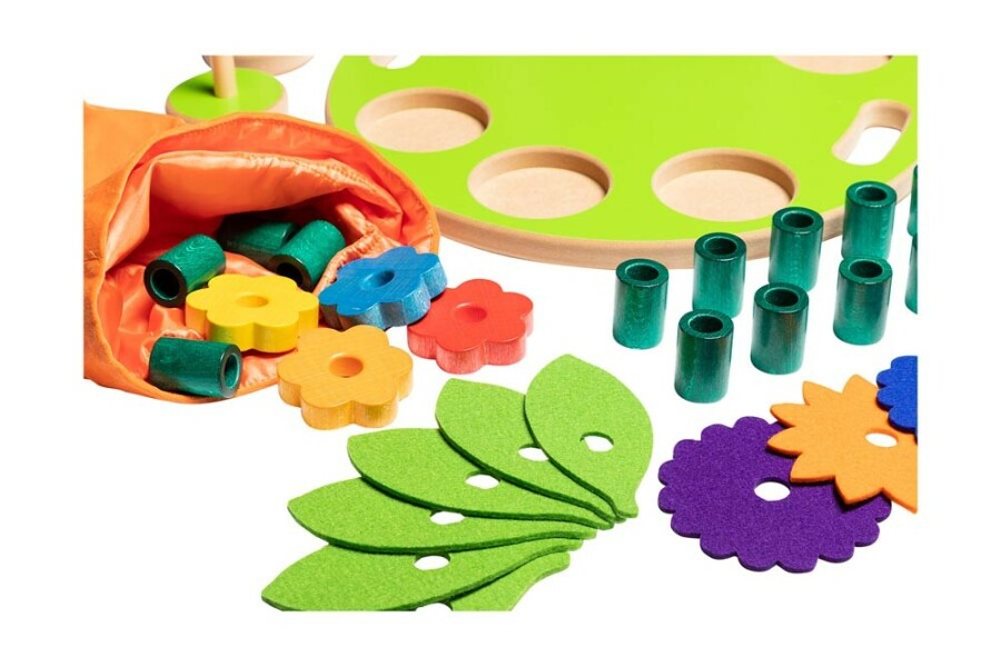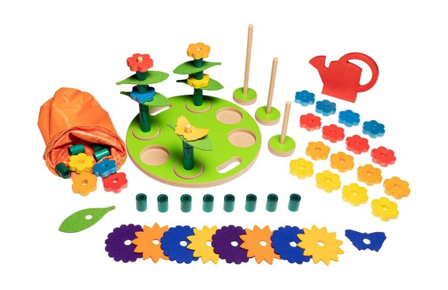 Bouw je eigen bloemenveld en laat het steeds verder groeien. Torens kunnen uit de plaat voor vrij spel en ontwerpen. De houten gieter stimuleert fantasie en rollenspel. Viltdelen geven textuur en kleur, prettig voor kleine handen. Prachtig voor thema tuin, seizoenen en tellen.