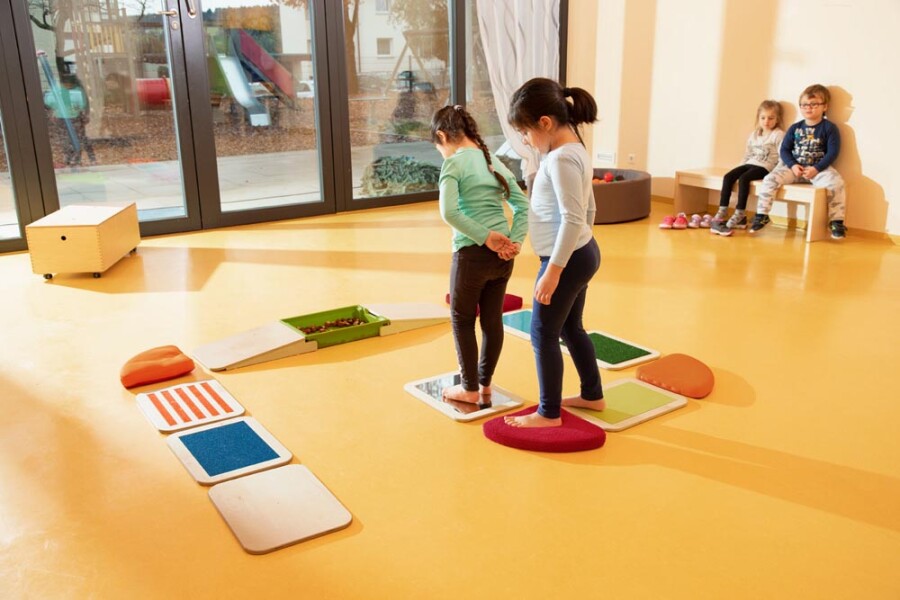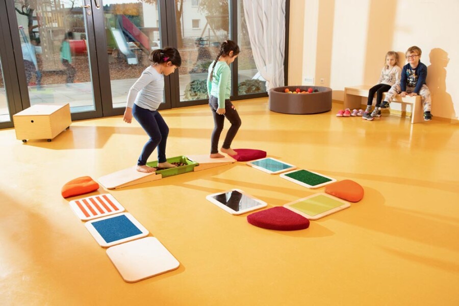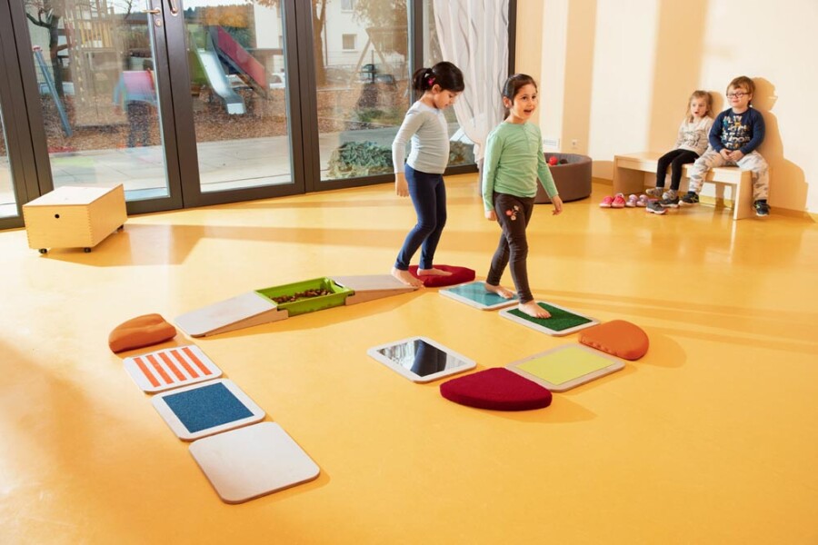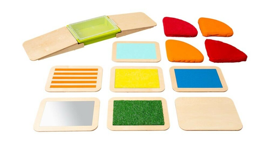 Kinderen trainen evenwicht en tastzin op dit 14-delige parcours voor blote voeten. Ze stappen over stevige platen met verschillende structuren en zachte textiele elementen met diverse vullingen. Alles ligt stabiel dankzij antislip, ook de twee schuin lopende delen. De afsluitbare bak kan je zelf vullen voor nog meer prikkels. Geschikt voor kleuters tot bovenbouw, in de klas of therapieruimte.