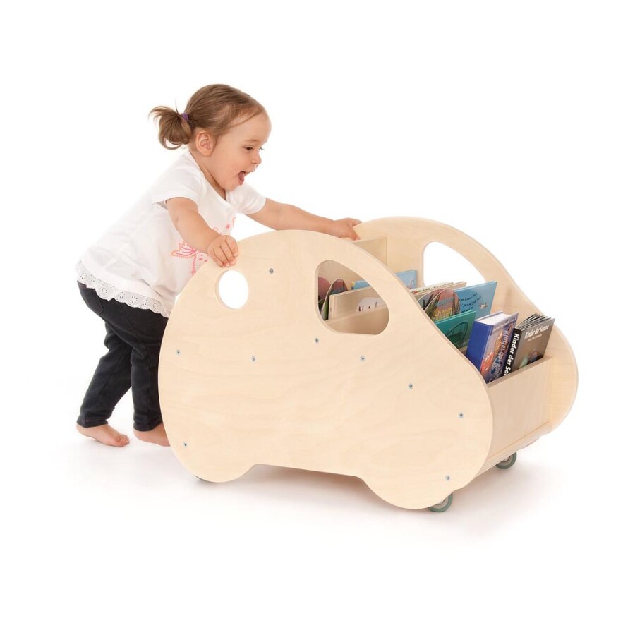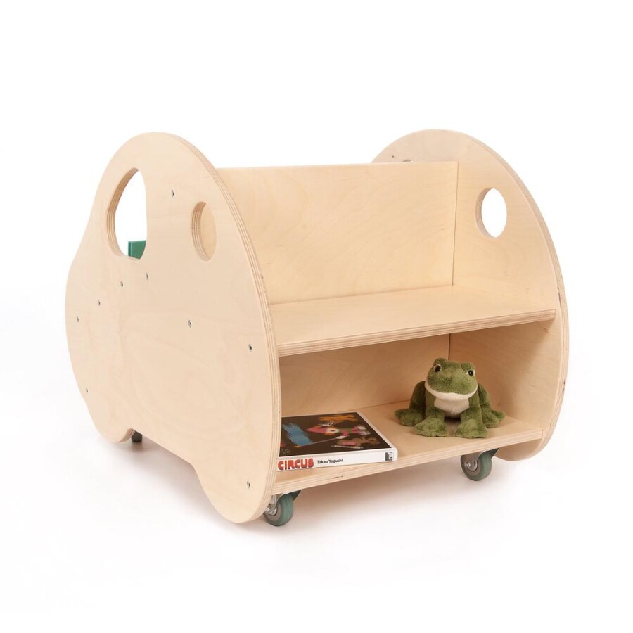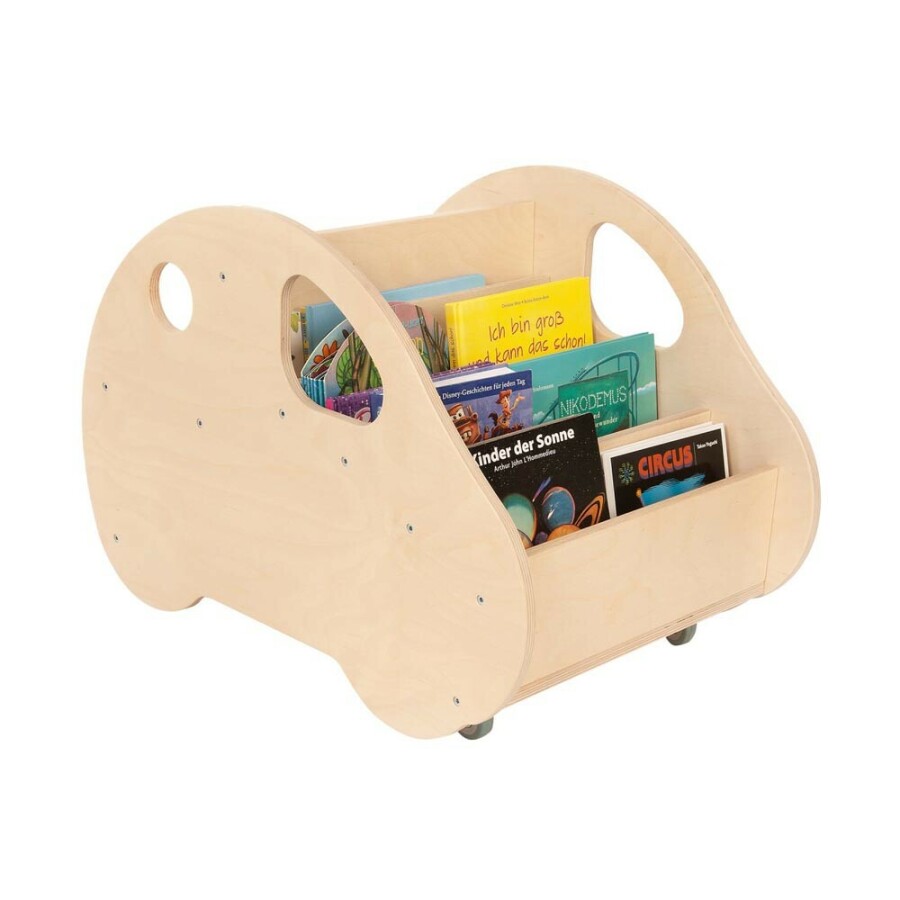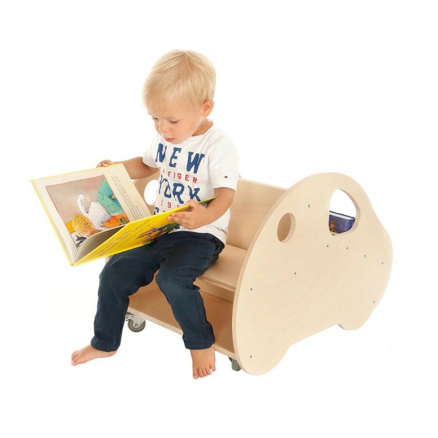 Boeken netjes bij de hand én een zitplek op wieltjes. Kinderen rijden hun favorieten mee en parkeren veilig met remmen. Vier vakken tonen covers overzichtelijk en nodigen uit tot lezen. Sterk multiplex met kindvriendelijke lak kan tegen een stootje. Ideaal voor hoeken, gangen en flexibele leesplekken.