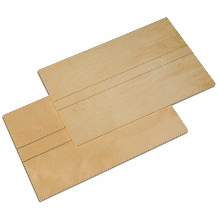 Blank gelakt, gelinieerd aan één zijde voor letters van de grote letterdoos, aan de andere zijde voor de letters van de medium letterdoos.