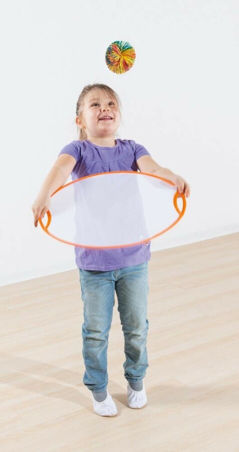 Een dynamisch vang- en werpspel dat motoriek en samenwerking prikkelt. Met twee handen houd je de ring vast en laat je een bal stuiteren op het net. De stevige metalen ring met nylon bespanning geeft een trampolinachtig effect. Geschikt voor individuele oefeningen en groepsspellen in gym of op het plein. Ballen niet inbegrepen.