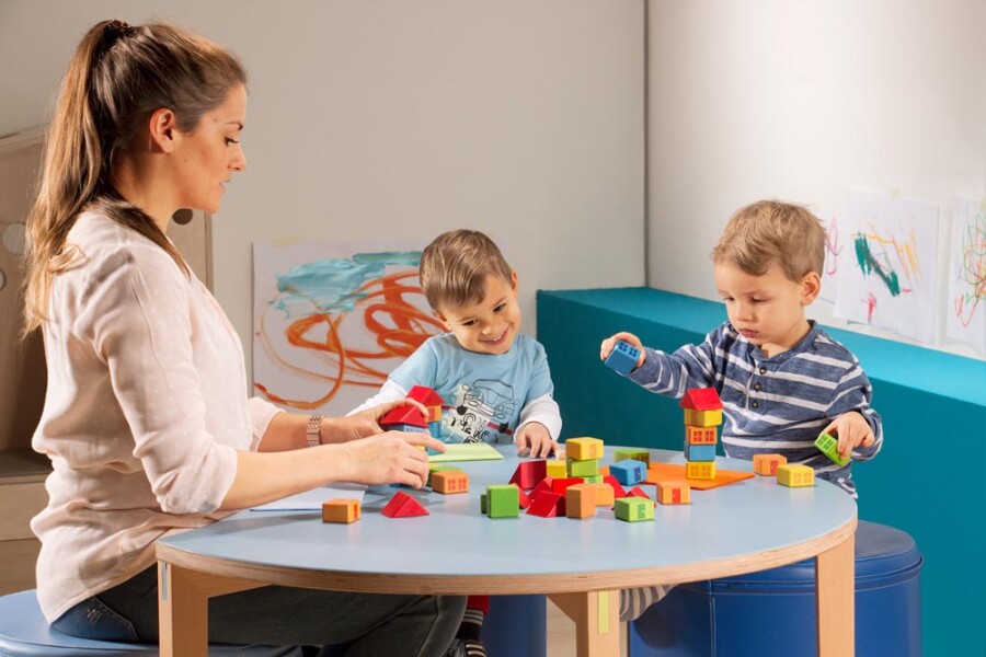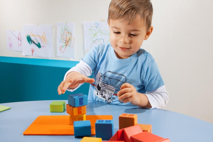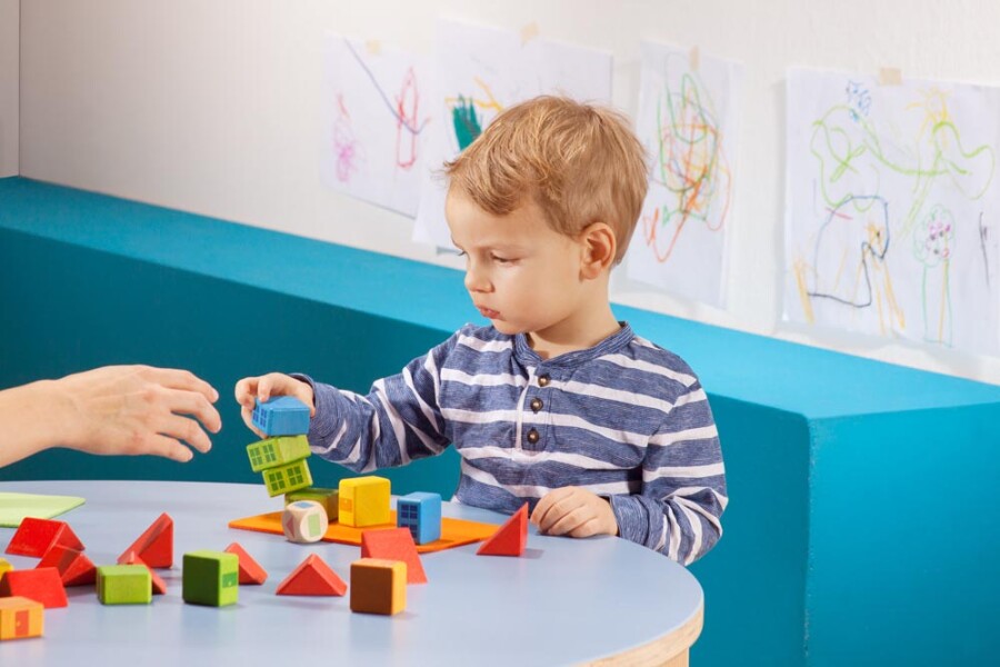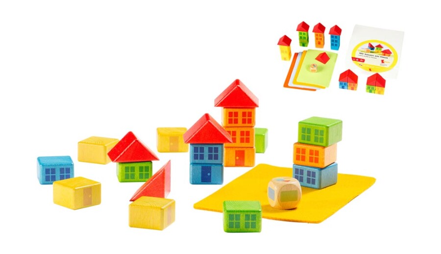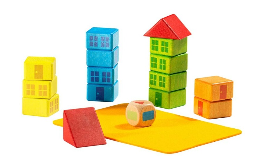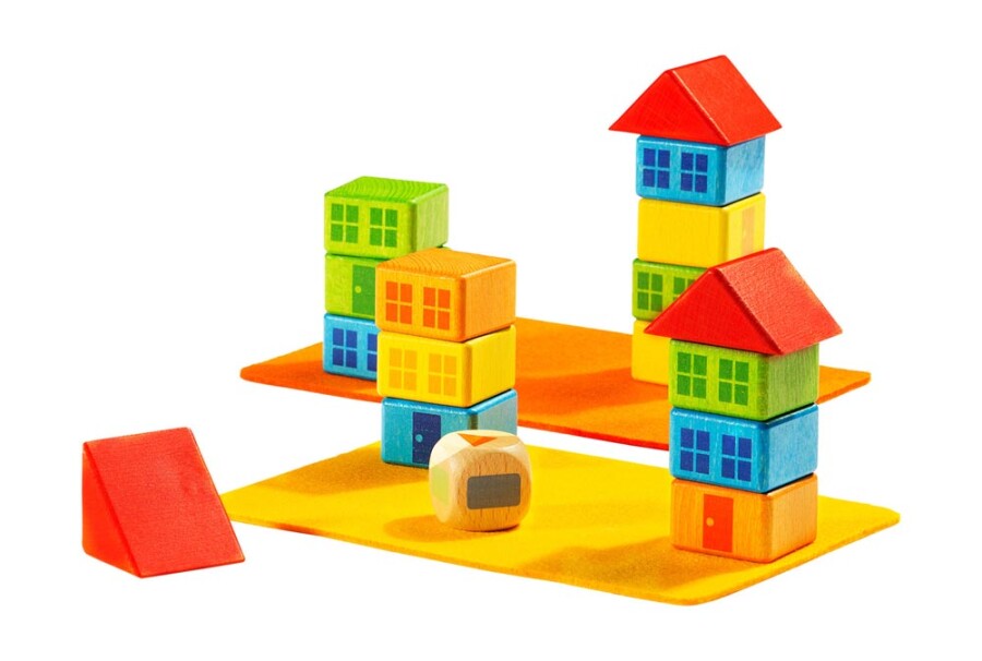 Vrolijk stapelspel voor jonge bouwers. Met gekleurde blokken en daken ontstaan huizen, torens en zelfs een klein stadje. De viltmatten dempen het geluid tijdens bouwen en dobbelen. Kies een spelvariant uit de handleiding of speel vrij. Alleen of samen in de groep, altijd snel klaar te leggen.