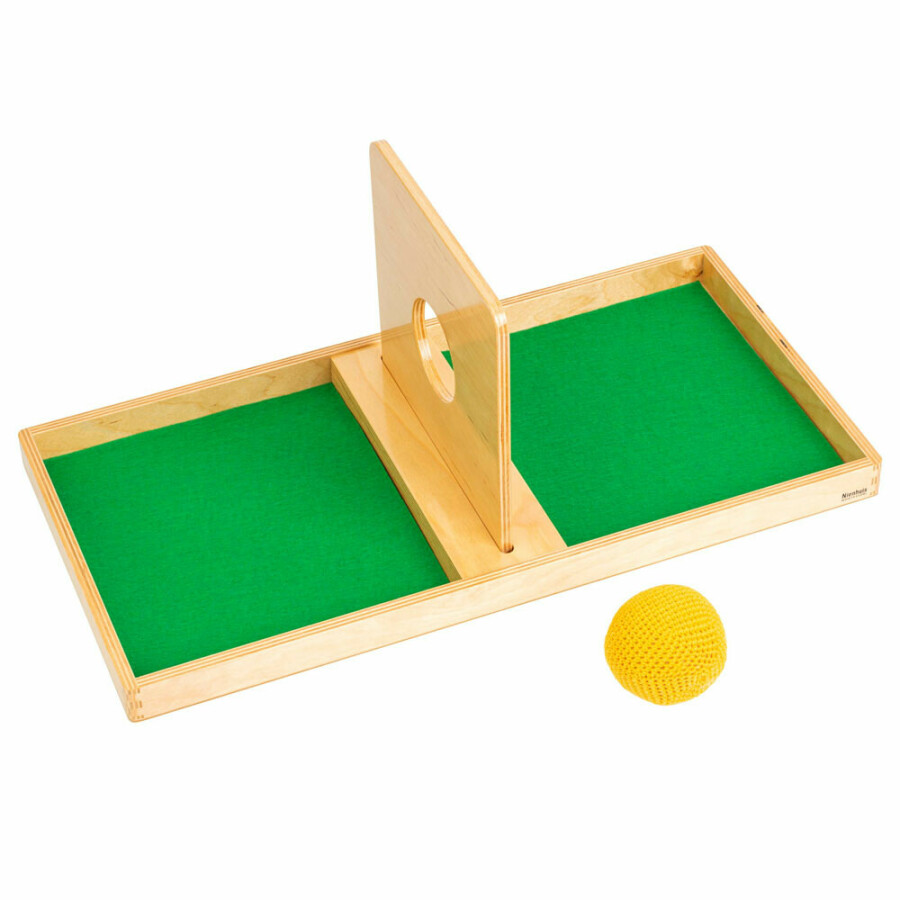 Een houten blad, afmetingen 50 x 25 x 2,5 cm, in tweeën gedeeld door een verwijderbaar bord met een opening voor de bal. Het kind stopt de bal door de opening waar hij verdwijnt achter het bord. Het gebruik van de hand en de pols wordt hierbij geoefend. Ook de grove motoriek wordt gestimuleerd, omdat het kind steeds naar de andere kant kruipt om te kijken waar de bal gebleven is. Met twee kinderen spelen is ook mogelijk: aan iedere kant zit een kind en over en weer wordt de bal door het gat in de plank gestopt.