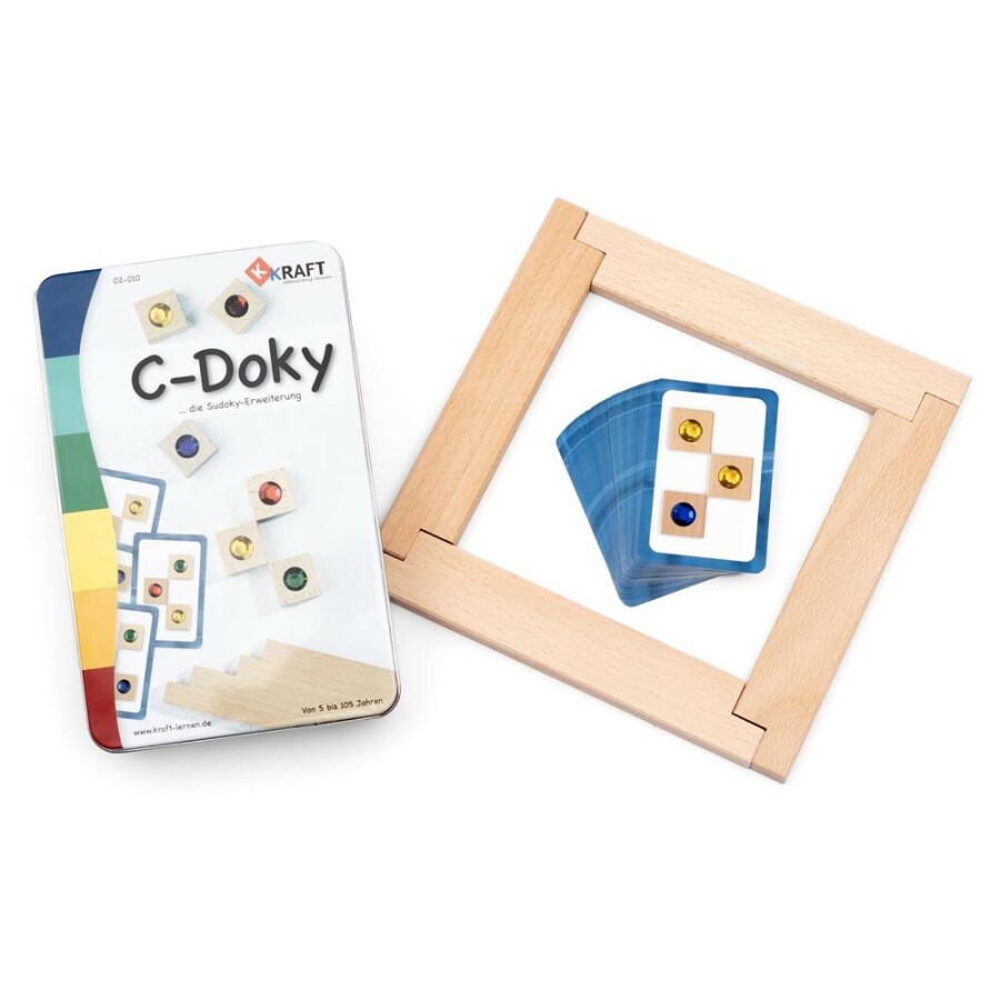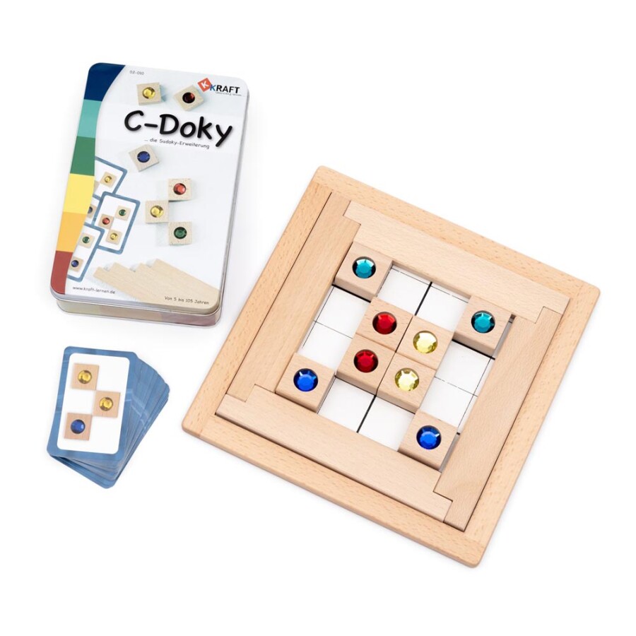 Breid het basisspel Sudoky uit met een nieuwe serie kleurpuzzels in C-vorm. De kaarten vragen goed kijken, omdenken en plannen. Kinderen en volwassenen trainen concentratie en ruimtelijk inzicht spelenderwijs. Leg de stenen, vergelijk met de kaart en corrigeer zelf. Alles zit netjes in een stevig blik, klaar voor onderweg.