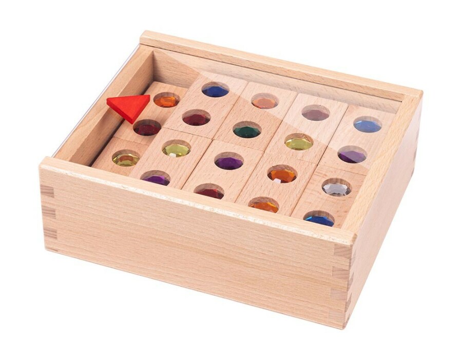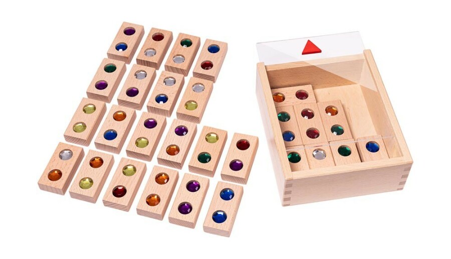 Kinderen leggen bij dit domino spel steeds dezelfde kleur diamant tegen elkaar. De houten stenen voelen stevig en glad. De inlegsteentjes schitteren en maken kleuren vergelijken leuk. Spelenderwijs oefenen ze concentratie, sorteren en woordenschat. Ideaal voor kleine groepjes in klas of thuis.