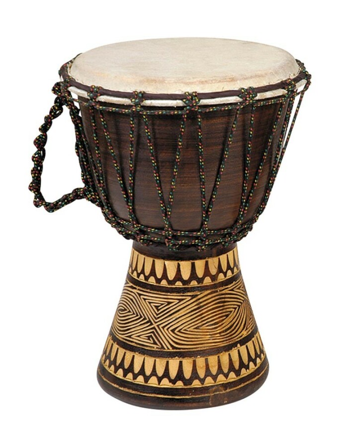 Handzame djembé met iets meer volume en projectie. Het donkerhouten lijf heeft een fraai gegraveerd motief. Het gespannen natuurvel geeft een levendige klank met veel dynamiek. Fijn voor ritmeoefeningen en ensemblespel.
