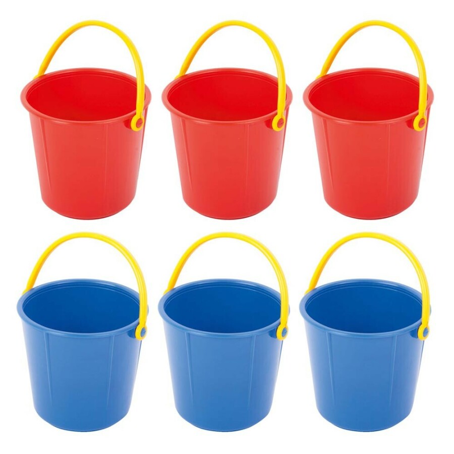 Met zes emmers kan de hele groep aan de slag. De set bevat drie blauwe en drie rode exemplaren. Elke emmer heeft 2 liter inhoud en staat stevig. Ideaal voor waterbanen, zandprojecten en sorteeropdrachten.