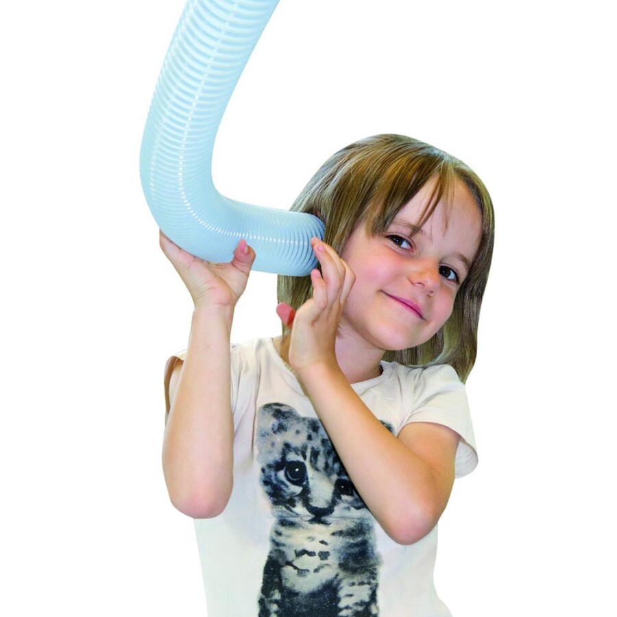 De flexibele experimenteerslang is ideaal voor knikkerbanen, klankspel en samenwerkingsoefeningen met de hele groep. Laat verschillende ballen of materialen rollen en bespreek het geluid, de snelheid en de beste aanpak. Kinderen overleggen, plannen en houden de slang samen precies goed, zodat niets terugrolt of valt. Gebruik hem ook als slangentelefoon om duidelijke spraak te oefenen.