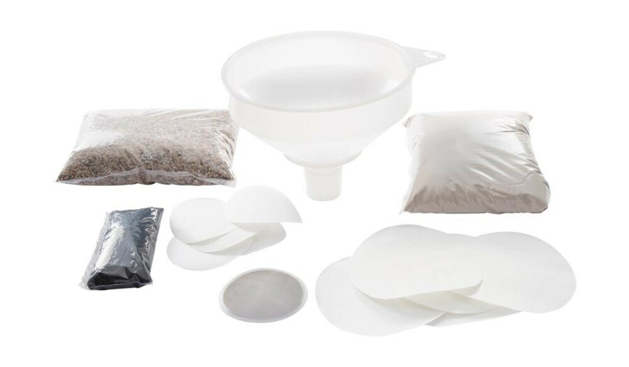 - 3 kg kwartszand, 3 kg kwartskiezels, 300 ml actieve kool