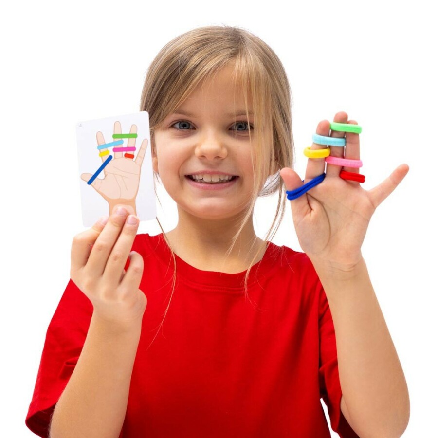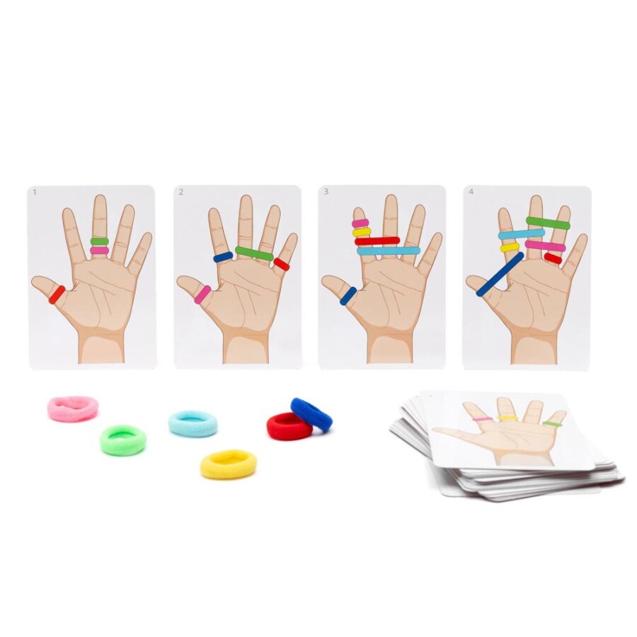 Een vrolijk vaardigheidsspel waarbij spelers elastiekjes precies volgens het kaartje over vingers verdelen. De regels zijn direct duidelijk, met oplopende niveaus voor focus, fijne motoriek en ruimtelijk inzicht. Speel solo of samen, beschrijf stappen hardop en train taal en geheugen op een speelse manier. De bel zorgt voor vaart en extra motivatie in de klas.