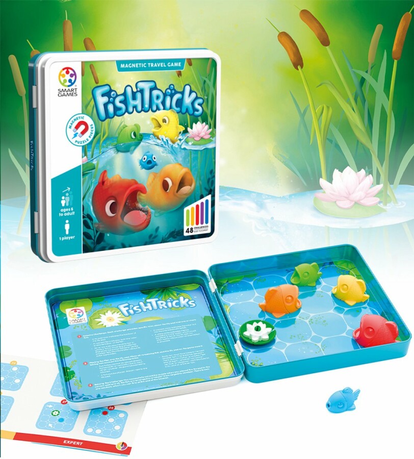 Voel je als een vis in het water met FishTricks, het slimme denkspel voor jong en oud! Rangschik de kleurrijke vissen van groot naar klein en zorg dat elke vis zijn kleinere vriendje volgt. Met 48 unieke uitdagingen wordt jouw brein elke keer opnieuw op de proef gesteld. Het spel stimuleert belangrijke vaardigheden: concentratie, logica, planning, probleemoplossend denken en ruimtelijk inzicht.