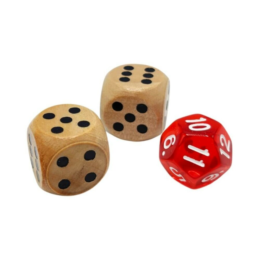 Twee houten dobbelstenen met stippen en één rode kantige kunststof dobbelsteen met de cijfers 1 tot en met 12.
