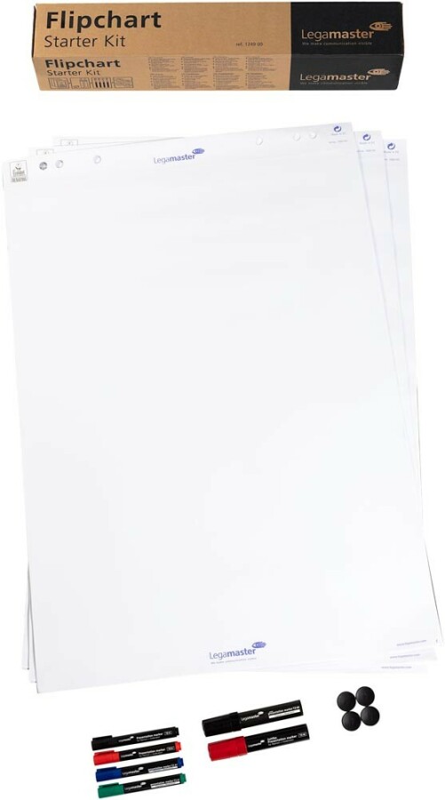 Deze complete set voor flipovers bevat hoogwaardige accessoires en meet 115 x 675 x 115 mm. De set omvat drie papierblokken voor flipovers, elk met 20 effen witte vellen. Voor het presenteren bevat de set twee TZ48 jumbo presentatiemarkers in zwart en rood, en vier TZ41 presentatiemarkers in de kleuren zwart, rood, blauw en groen. Daarnaast worden vier magneten met een diameter van 30 mm meegeleverd.