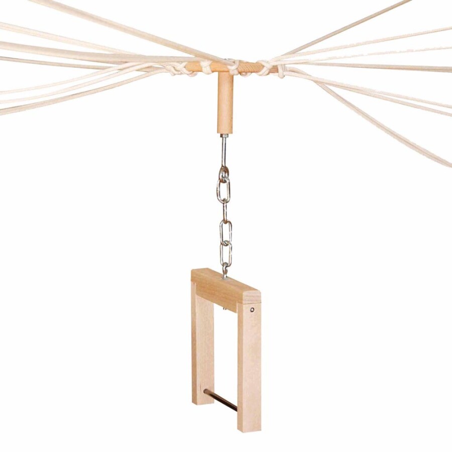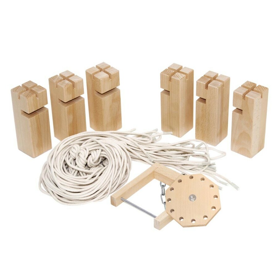 - 12 touwen ca. 4 m, haak en houten schijf
