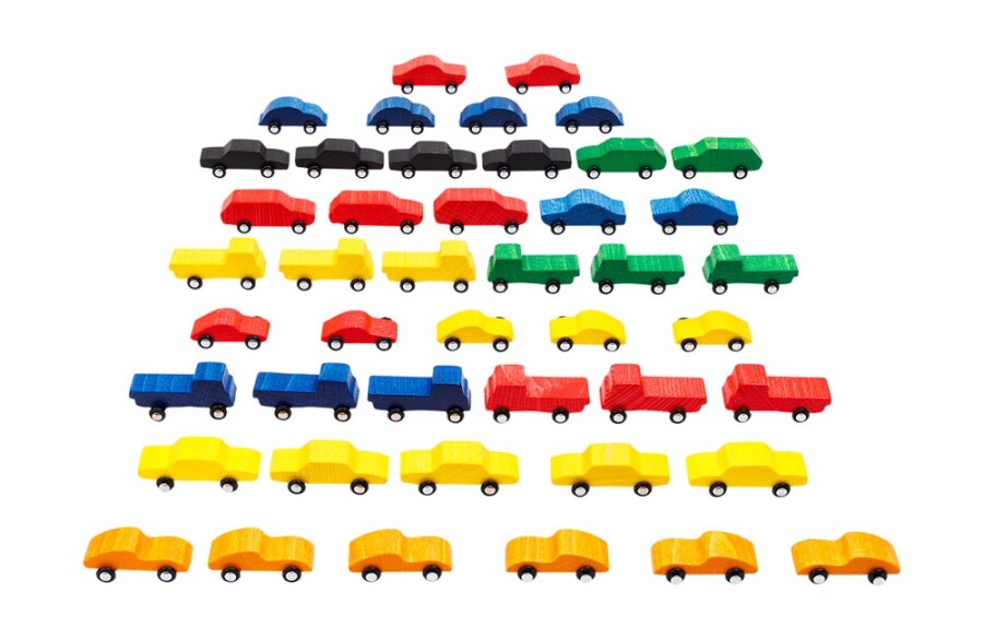 Zet kleine houten autootjes voor rollenspel, tellen en sorteren. Verschillende modellen en kleuren houden de aandacht vast. Perfect voor bouwhoek, speeltafel en beloningsbak. Past goed in kleine handen.