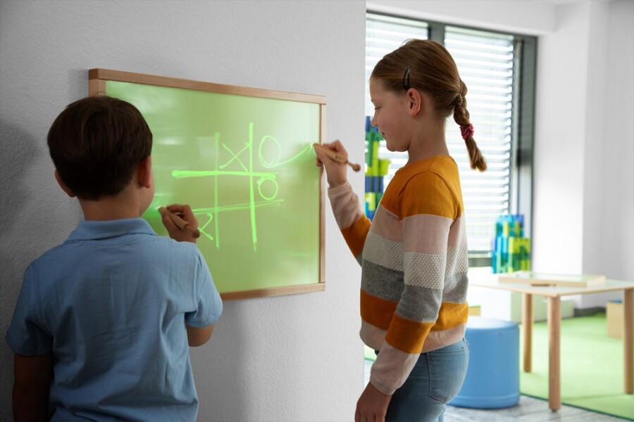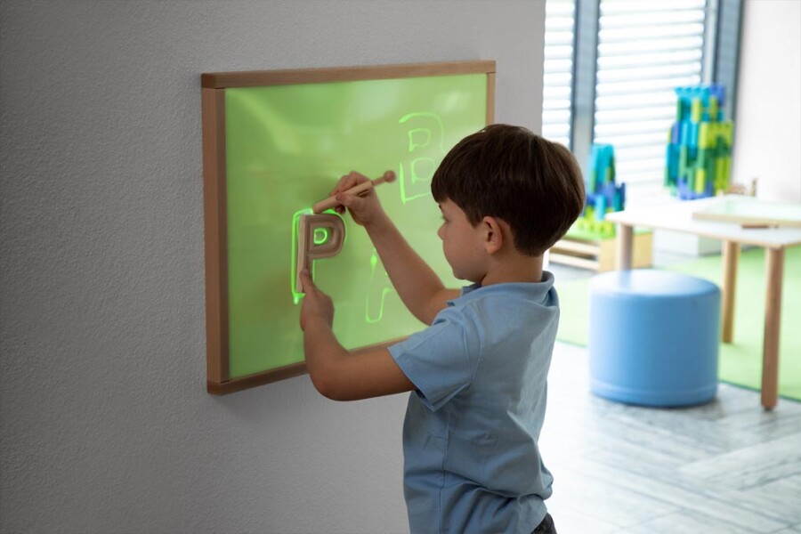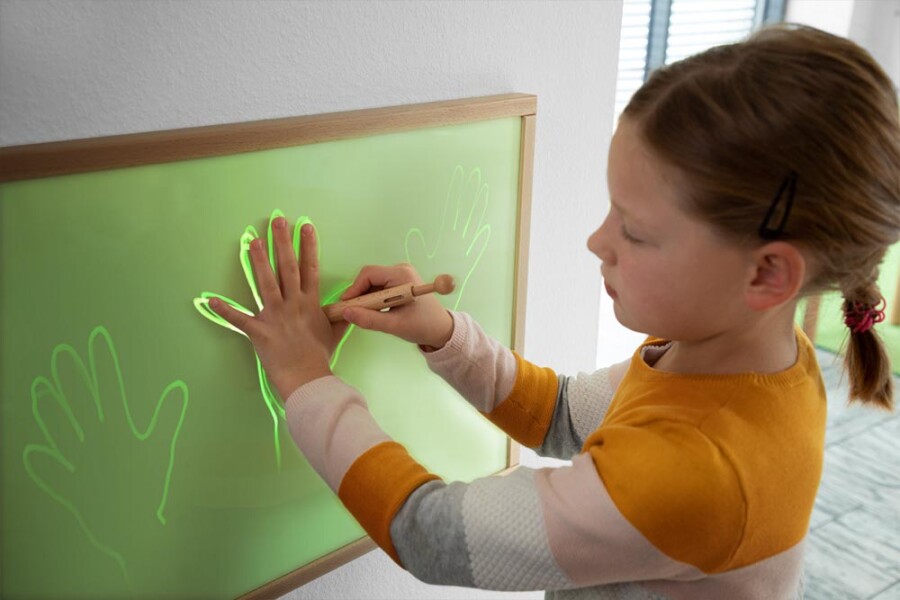 Met dit grote glow-tekenbord maak je in het donker oplichtende lijnen, vormen en vlakken. Je tekent met houten lichtstiften op een fosforescerende plaat; de sporen gloeien en vervagen langzaam. Zo ervaren kinderen visueel hoe tijd en beweging samenhangen. Werken met sjablonen of folie levert verrassende collages op en stimuleert creatieve opdrachten. Het bord versterkt fijne motoriek en oog-handcoördinatie, ideaal voor klasactiviteiten en thuisgebruik. Handig voor leerkrachten en ouders bij groepsopdrachten of individuele oefening. Inclusief ophangmogelijkheid en duidelijke gebruiksaanwijzing; let op: de acrylglasplaat is niet krasbestendig.