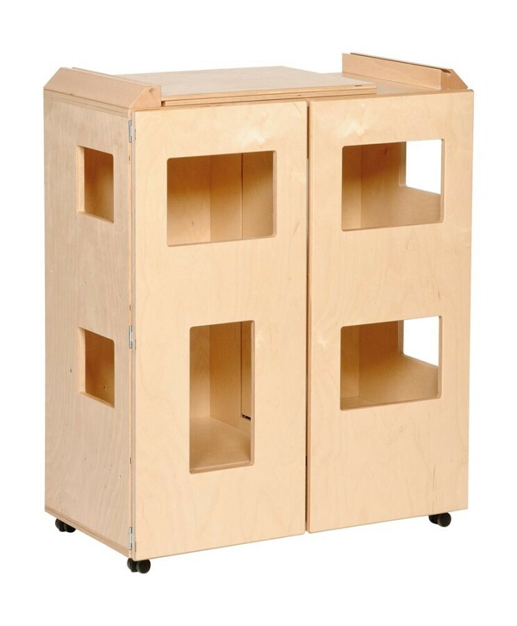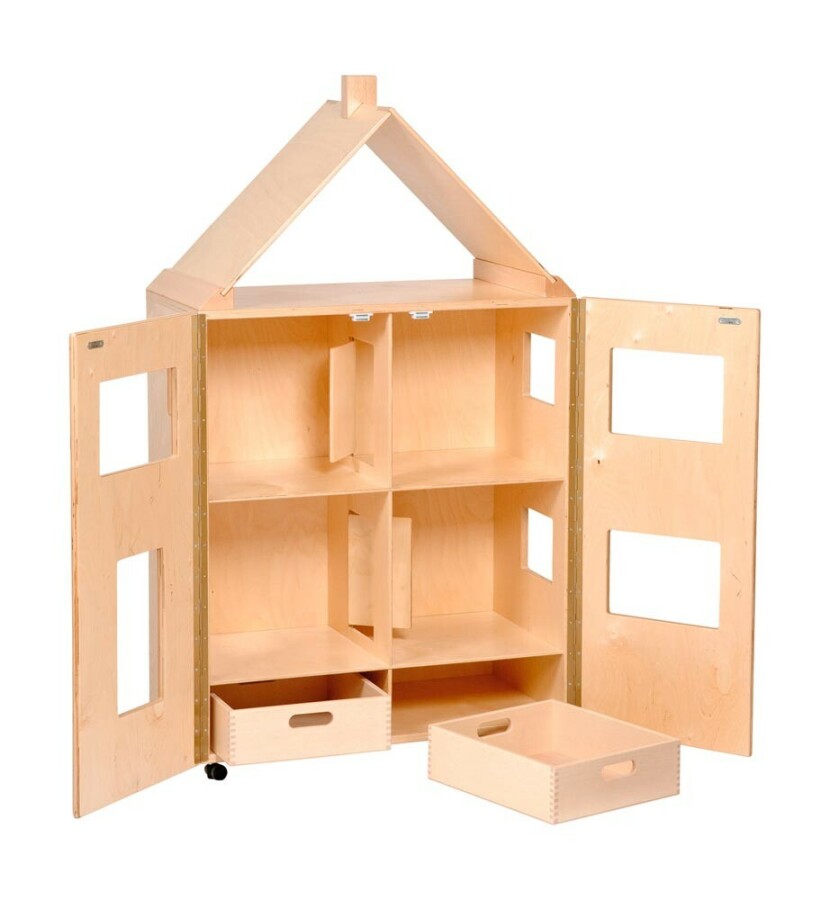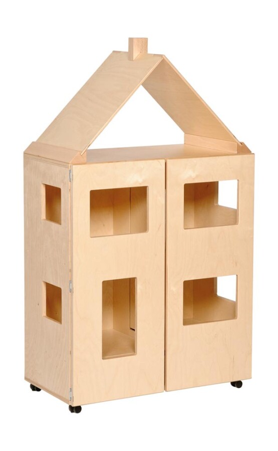 Een groot, verrijdbaar poppenhuis dat je eenvoudig naar elke speelhoek rijdt. Vier ruime kamers met zwaaideuren nodigen uit tot realistisch rollenspel met ook grotere buigpoppen. Twee opbergkisten houden meubeltjes en accessoires binnen handbereik. De buitendeuren sluiten het huis als een kast, wel zo opgeruimd. Het neutrale birkenhout vraagt om eigen behang, gordijntjes en seizoensdecoraties.