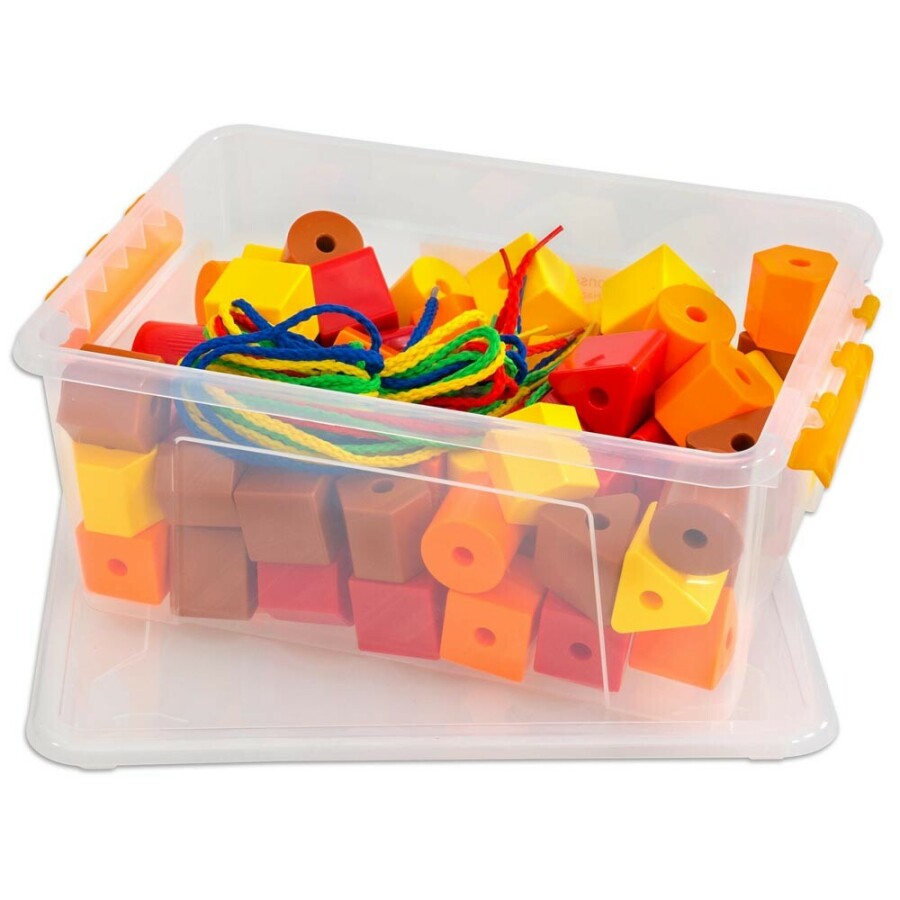 Met deze set van 90 grote kralen en vormen kunnen kinderen spelenderwijs hun fijne motoriek verbeteren. De verschillende kleuren en vormen maken het rijgen extra leuk en uitdagend. De grote gaten en stevige rijgkoorden zijn perfect voor kleine kinderhanden, waardoor ze gemakkelijk zelf aan de slag kunnen. Na het spelen berg je alles eenvoudig op in de handige opbergdoos. Ideaal voor in de klas of kinderopvang!