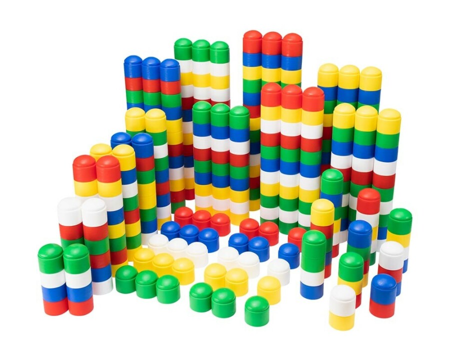 Met deze grote bouwdoppen bouwen jonge kinderen stabiele torens, muren en kronkelende vormen. De elementen klikken in elkaar, recht op recht of onder een hoek. Dat traint grijpkracht, oogâ€handcoördinatie en ruimtelijk denken. Door de vele onderdelen kan een groep samen werken zonder te hoeven wachten. Kleurige stukken nodigen uit tot sorteren en tellen.