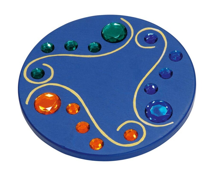 Deze grote tol geeft een kalm kleurenspel met zijn diepe blauw en sprankelende steentjes. Draaien lukt snel, ook met kleine handen. Goed voor motoriek, volhouden en samen spelen. Past prima in de rustige hoek of rekenkring.