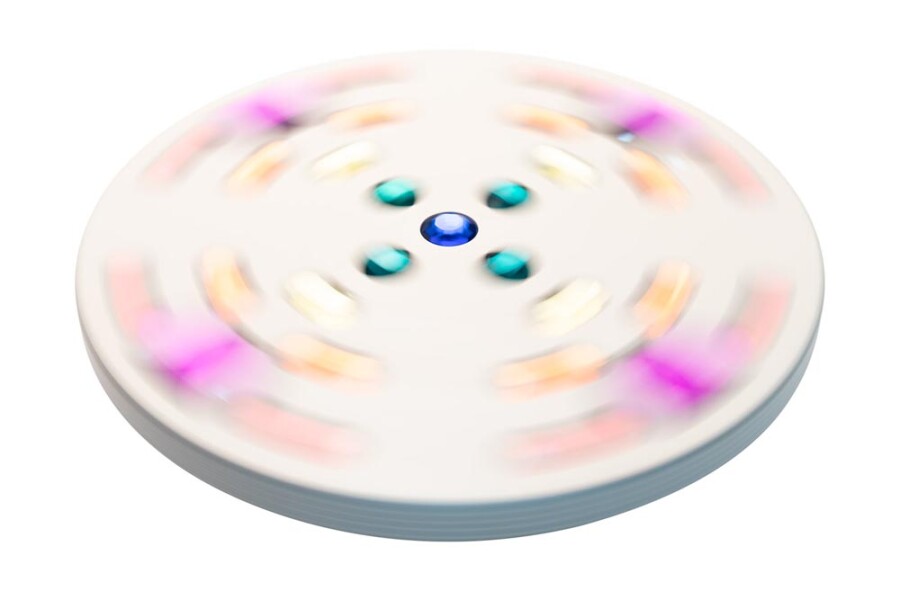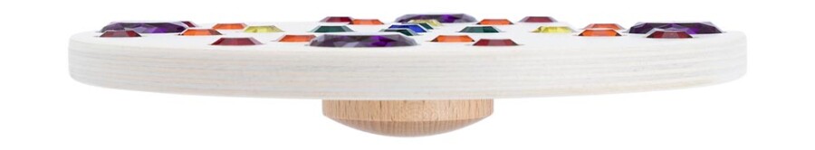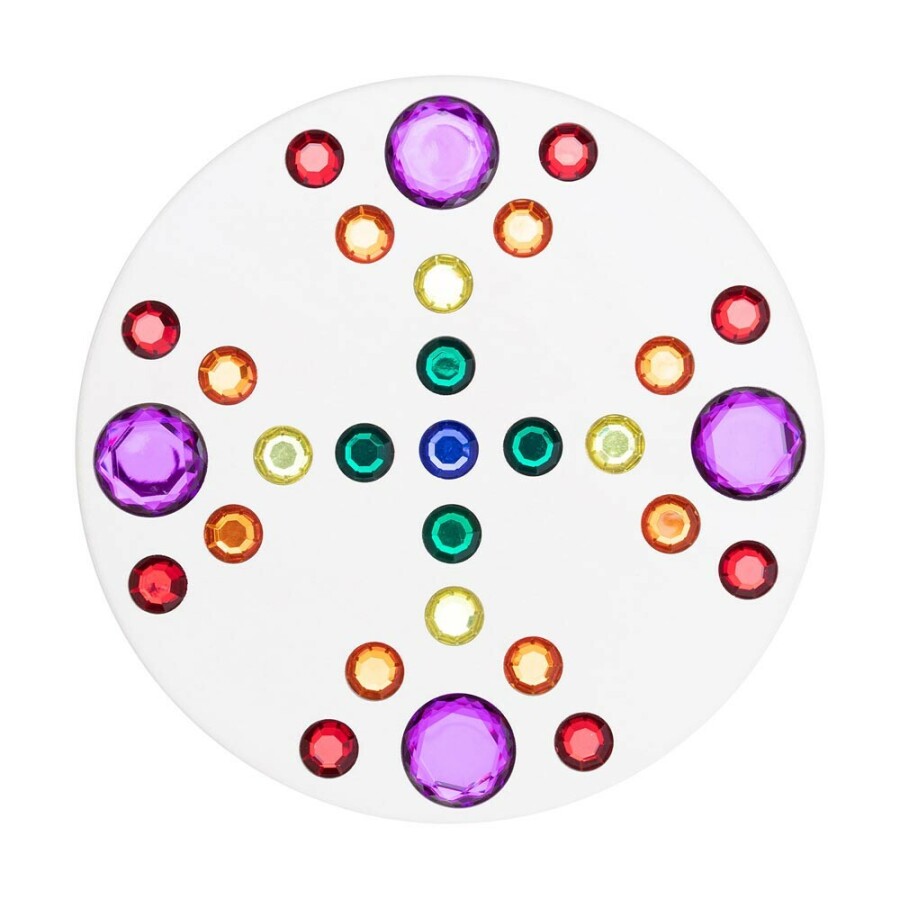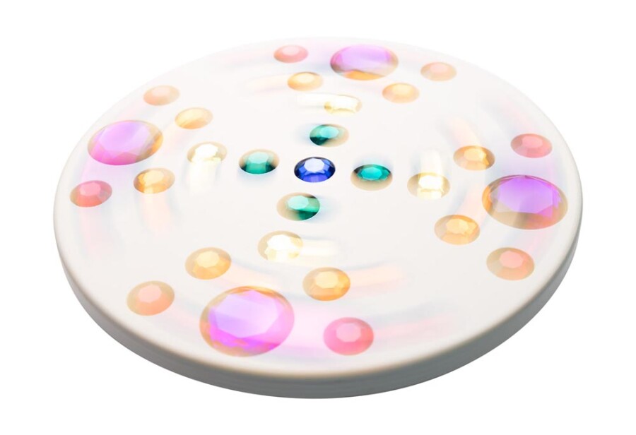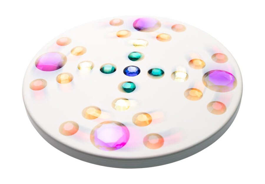 De witte tol laat de glinstersteentjes sterk contrasteren en geeft een helder kleurenspel. Door het simpele ontwerp is draaien direct succesvol. Fijn voor energizer, circuit of speeltafel. Past in elk thema en elke ruimte.