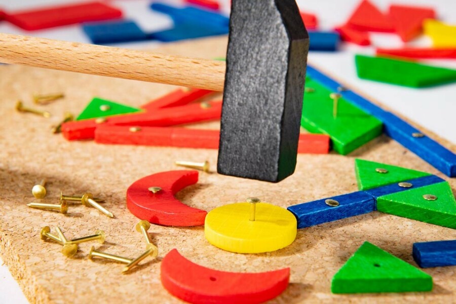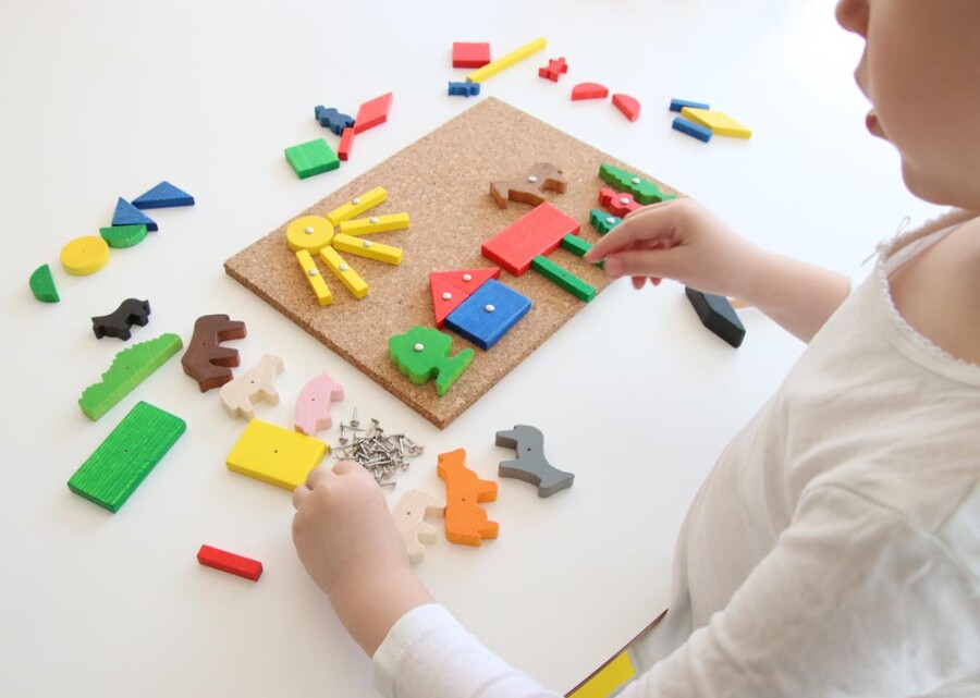 Beelden timmeren met vormpjes stimuleert creativiteit en vormherkenning zonder lijm. Kinderen plannen, prikken en variëren, individueel of in kleine groep. De kurkplaat beschermt tafelbladen en vangt de spijkertjes goed op.