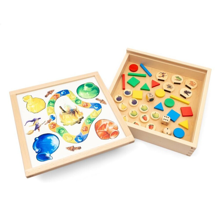 Taal, tellen en regels leren while you play: eerst een kleurrijk bordspel met de heks en haar flessen, daarna omdraaien voor een magnetisch legspel. Kinderen benoemen kleuren, dieren en fruit, spreken ritmes en oefenen beurten. De magnetische figuren staan stevig en zijn makkelijk te grijpen. Spelregels zijn eenvoudig uit te bouwen, passend bij de groep. Alles netjes opgeborgen in de houten box.