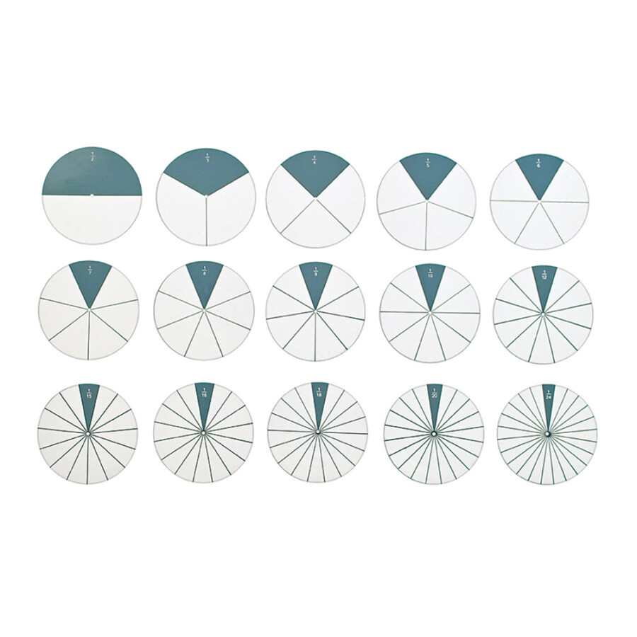 - 1 set breukdelen (1/1 wit: 1 ex., 1/2 paars: 2 ex., 1/3 blauw: 3 ex., 1/4 rood: 4 ex., 1/6 geel: 6 ex., 1/8 lichtgroen: 8 ex., 1/12 oranje: 12 ex., 1/24 donkergroen: 24 ex.)