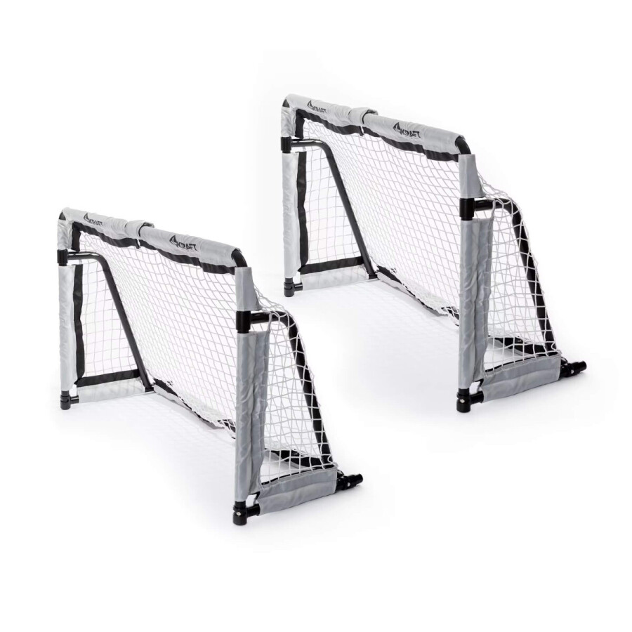 Laat het spel beginnen, waar je maar wilt! Deze set van twee inklapbare doelen is ideaal voor kinderen om te voetballen, hockeyen of gewoon lekker te bewegen, zowel binnen in de gym als buiten in de tuin.