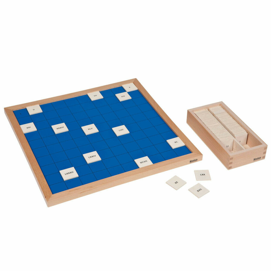 Dit materiaal worden gebruikt nadat het kind het oorspronkelijke honderd bord beheerst. Het concept is hetzelfde, maar deze versie is bedrukt met Romeinse cijfers. Het materiaal bestaat uit een houten bord bedrukt met 100 vierkanten en een doos met deksel met houten fiches bedrukt met de Romeinse cijfers 1-100.