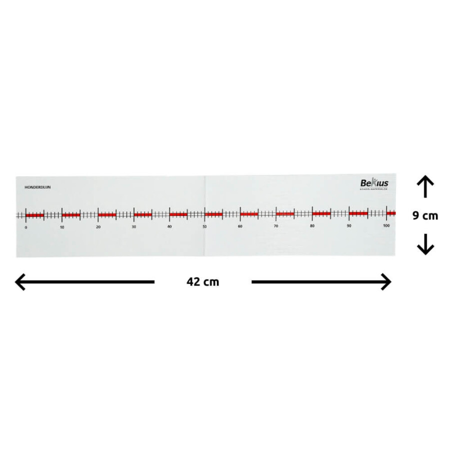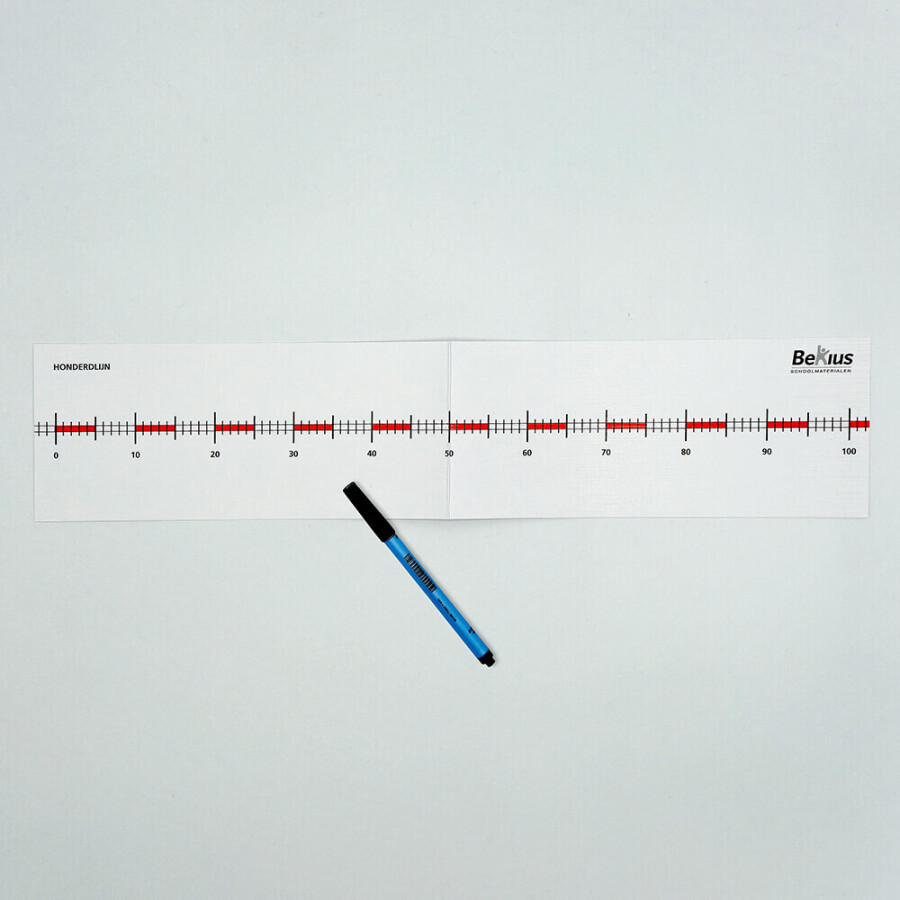 Individuele getallenlijn van 0 -100 (5 exemplaren). Deze is te beschrijven met de uitwisbare stift. Deze gelamineerde getallenlijnen individueel zijn bij uitstek geschikt als remediërend materiaal, op de instructietafel, voor individueel gebruik en passen bij elke rekenmethode. De leerlingen kunnen op de getallenlijnen schrijven met de uitwisbare stift. Wanneer ze hun opdracht klaar hebben kunnen ze dit weer verwijderen met het poetsviltje wat op de dop zit. Zo zijn de getallenlijnen altijd weer te gebruiken.
