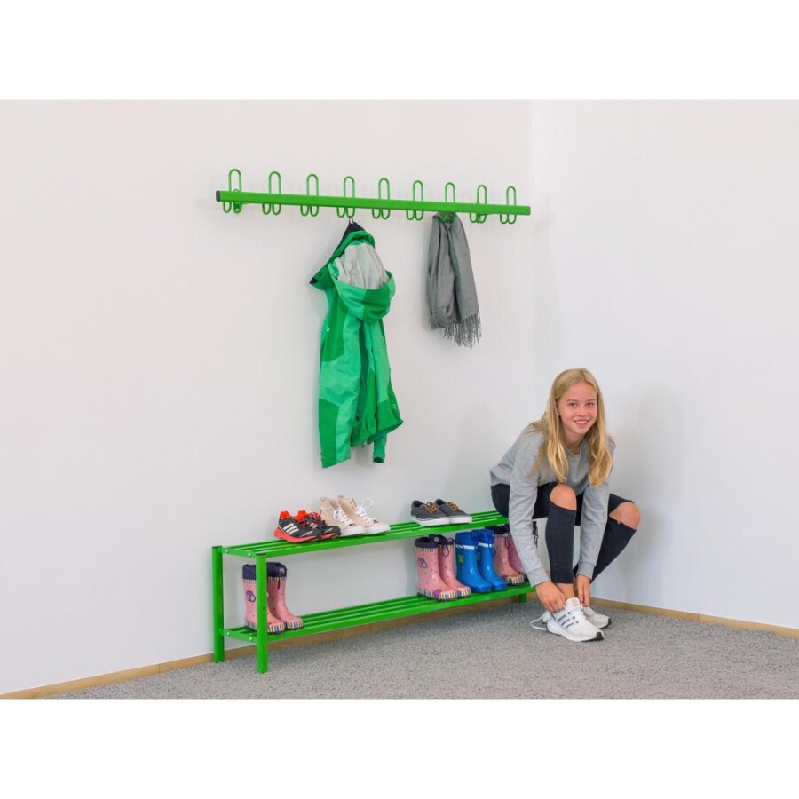 Dit stevige schoenen- en laarzenrek van 150 cm hoog is perfect voor scholen en kinderdagverblijven. Het biedt ruimte voor 6 tot 9 paar schoenen of laarzen en is ideaal voor het netjes opbergen van natte rubberen laarzen en winterlaarzen. Het rek is gemaakt van hoogwaardig gepoedercoat staal, waardoor het zeer stabiel is en eenvoudig zelf te monteren. De bovenkant kan ook gebruikt worden als bankje, handig voor kinderen om hun schoenen aan of uit te trekken. Combineer het met andere garderobeelementen voor een complete opbergoplossing.