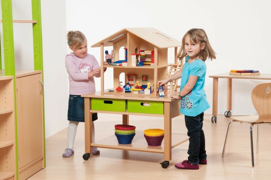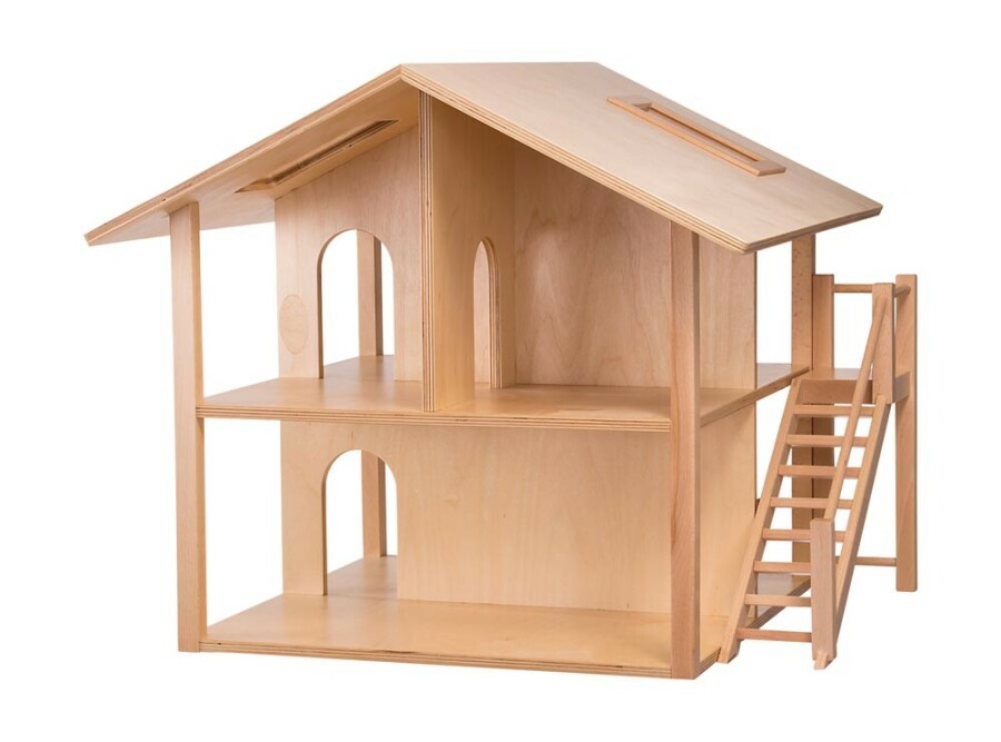 Stevig houten poppenhuis, speciaal voor gebruik op school en thuis. Het is aan alle kanten open, zodat kinderen makkelijk bij alle kamers kunnen. Met zes kamers kunnen meerdere kinderen tegelijk spelen zonder dat het te veel ruimte inneemt. Twee uitneembare acrylglasramen en een flexibele trap maken het spelen extra leuk en praktisch. De constructie is robuust. 19 mm massief beuken voor pilaren, trap en dakramen. Wanden en dak zijn 12 mm verlijmd berkenhout. Alle onderdelen zijn gelakt en makkelijk schoon te maken. Wordt geleverd als compleet huis, klaar voor gebruik.