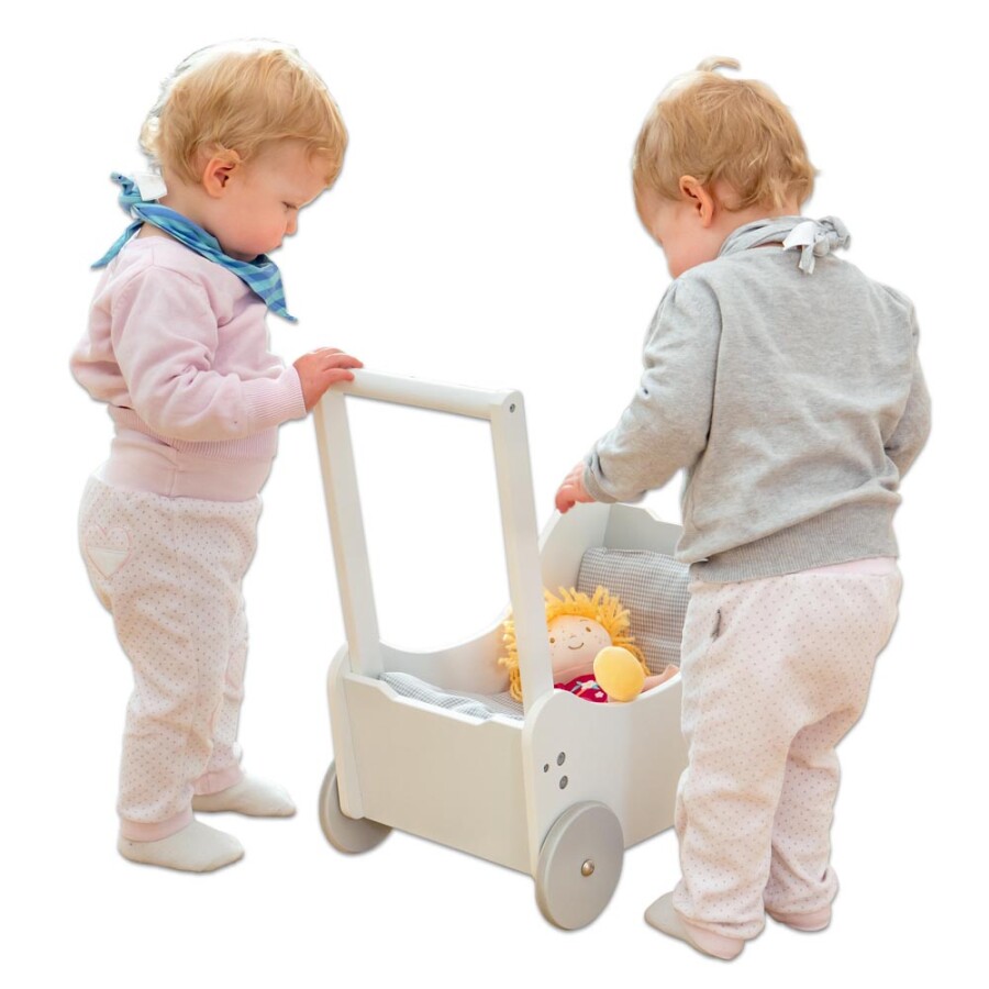 De houten poppenwagen met verstelbaar handvat is perfect voor kleine poppenouders in de leeftijd van 2 tot 6 jaar. Gemaakt van stevig beukenhout, biedt deze poppenwagen een stabiele en stille rit dankzij de rubberen wielen. De handgreep is in drie standen verstelbaar, zodat kinderen van verschillende lengtes er comfortabel mee kunnen spelen. Inclusief een zacht kussentje en dekentje van 100% polyester, blijft de pop altijd warm en comfortabel. Let op, de poppenwagen wordt als bouwpakket geleverd, maar is eenvoudig in elkaar te zetten met de meegeleverde handleiding.
