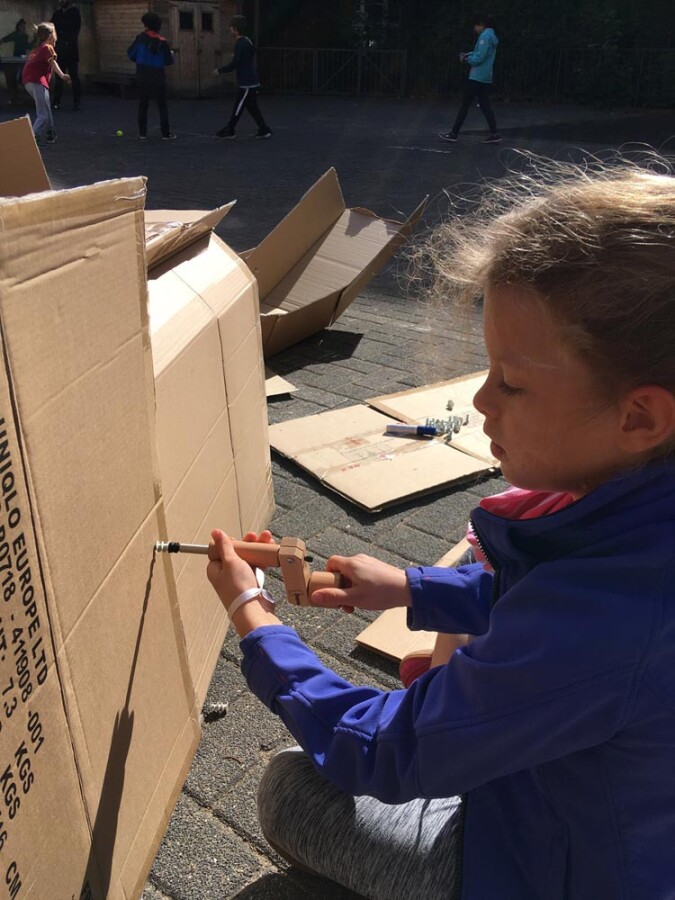 Met deze houten schroefboormachine bouwen kinderen stoere kartonprojecten. De soepele slinger laat je boren en schroeven zonder batterijen. Plaats een plug op de boor en draai door meerdere lagen karton. De verbinding blijft stevig en is weer los te halen. Ideaal voor technieklessen en knutselen.