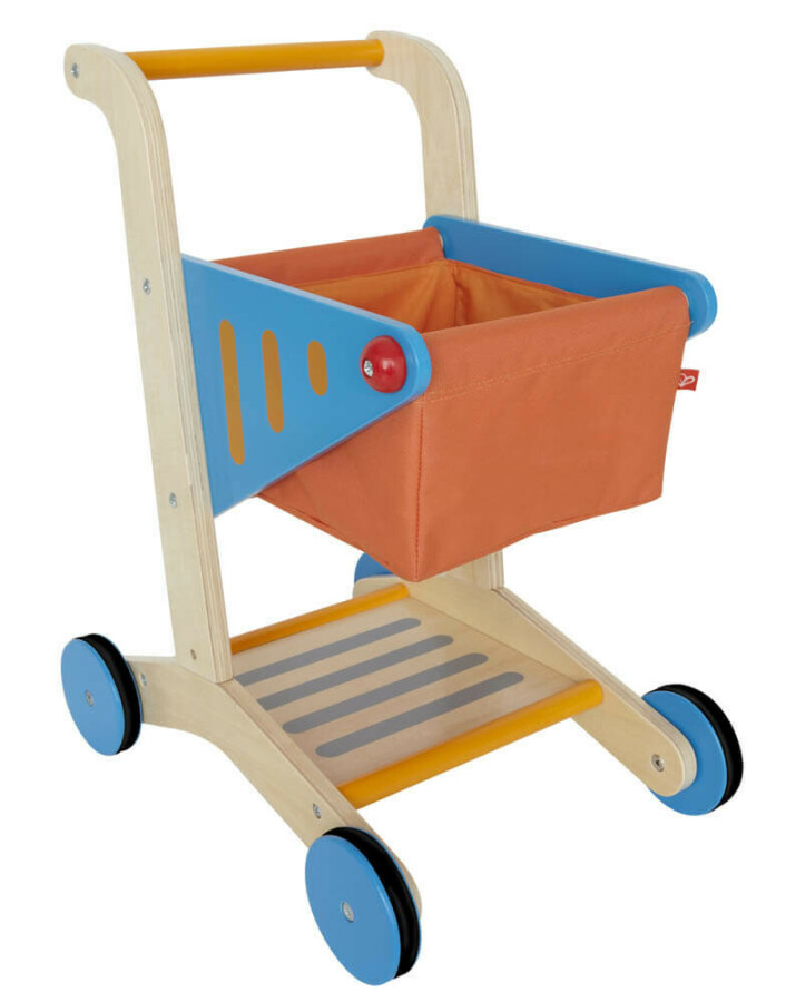 Maak van winkelen en boodschappen doen een leuke activiteit in de winkelhoek met deze houten speelgoed winkelwagen!