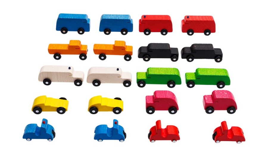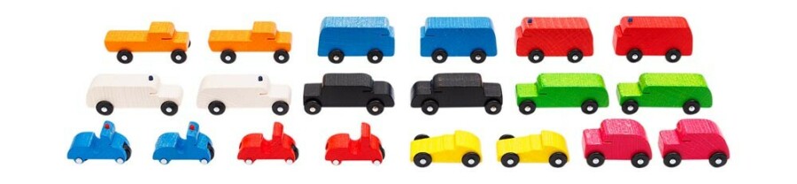 Robuuste houten autootjes voor vrij spel, sorteren en kleine reken- of taalopdrachten in de klas. De set biedt tien modellen, telkens in tweevoud, zodat iedereen tegelijk kan rijden en vergelijken. Ze komen in een katoenen zak, handig op te bergen en mee te nemen.