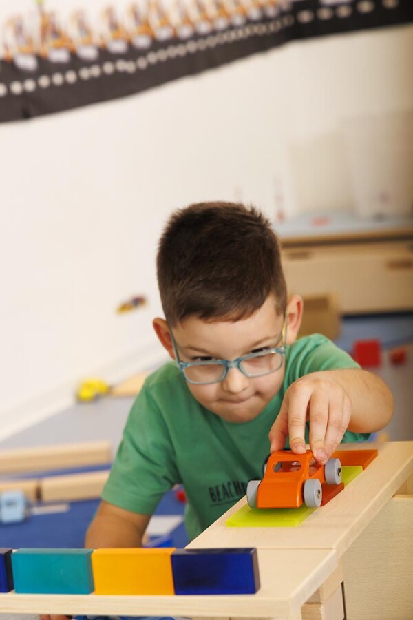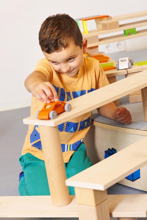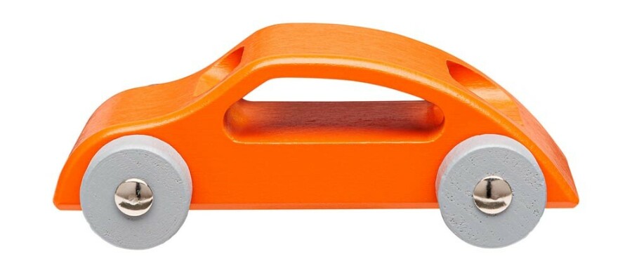 De oranje houten sportwagen valt op in elke speelhoek en rijdt soepel over elke baan. Doorlopende stalen assen en een massieve body maken hem uiterst robuust. Kinderen pakken hem makkelijk vast en nemen hem overal mee naartoe.