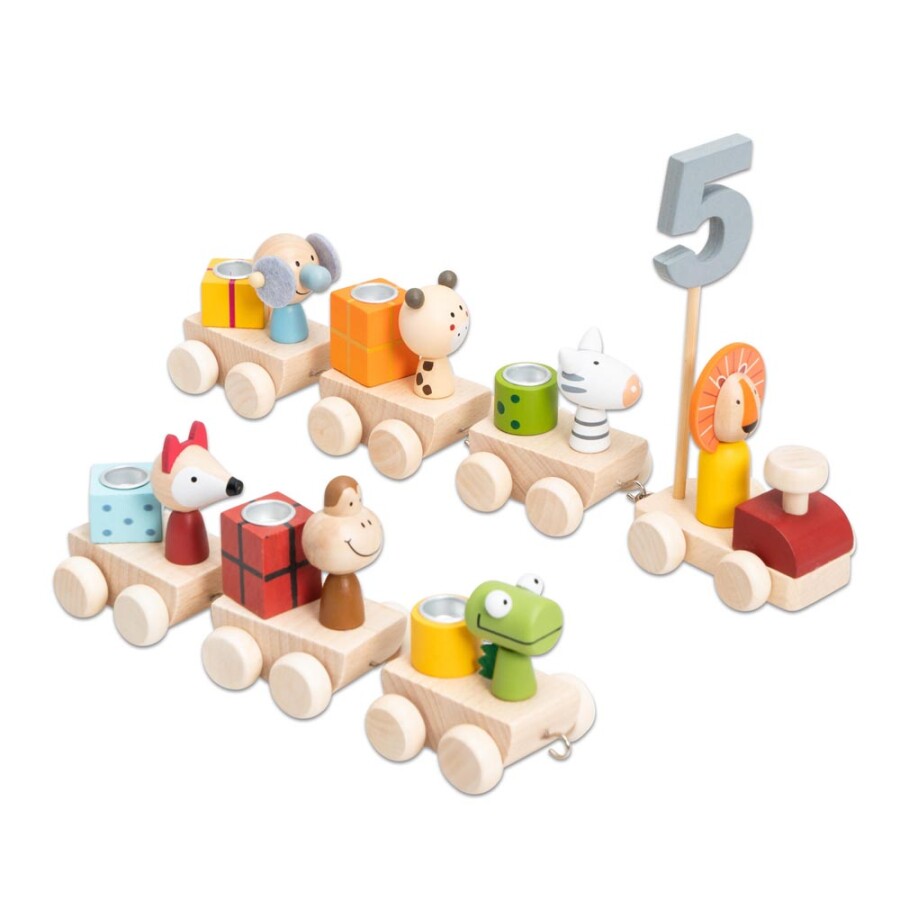 De houten verjaardagstrein met dieren is een vrolijke en kleurrijke toevoeging aan elke verjaardagstafel op school. Deze 16-delige set bestaat uit een locomotief, zes wagons en zeven schattige houten dieren: een leeuw, zebra, olifant, krokodil, luipaard, vos en aap. De trein wordt geleverd met houten cijfers van 1 tot 9, zodat je elk jaar de juiste leeftijd kunt weergeven. De volgorde van de wagons is aanpasbaar, zodat je de trein steeds weer uniek kunt maken voor elk jarige kind. De stevige houten constructie zorgt ervoor dat de dieren en kaarshouders veilig op hun plek blijven.