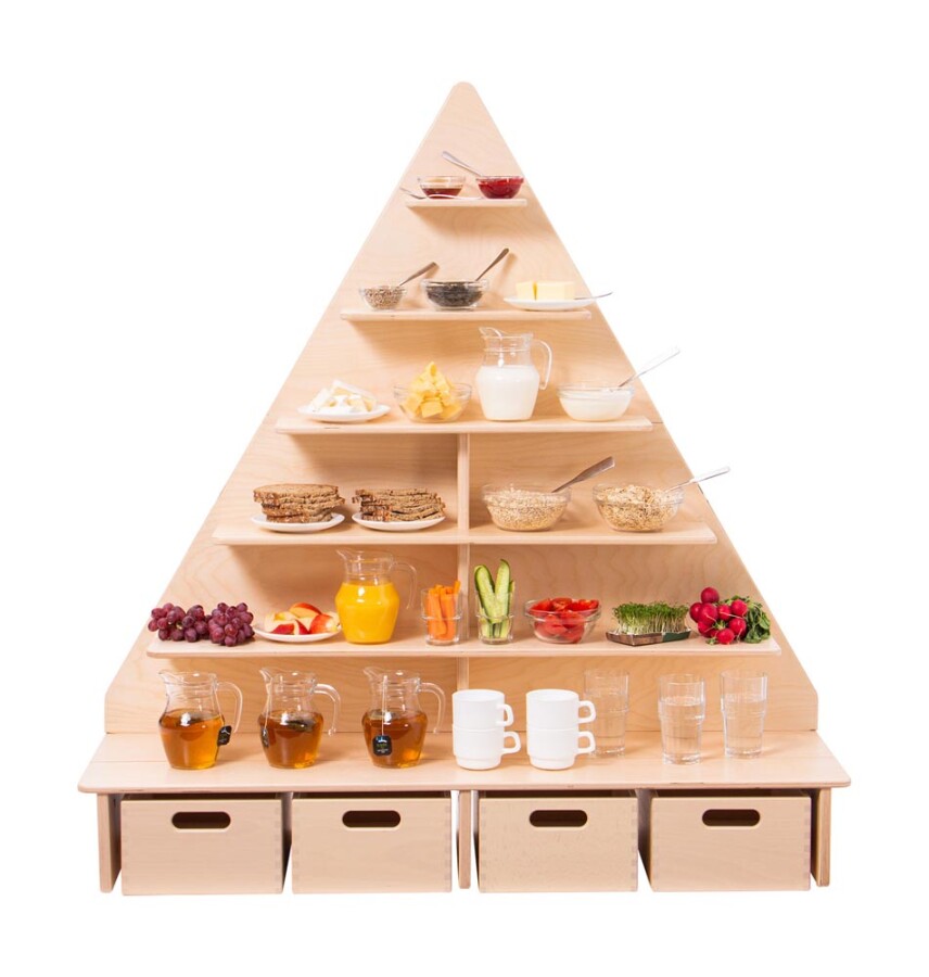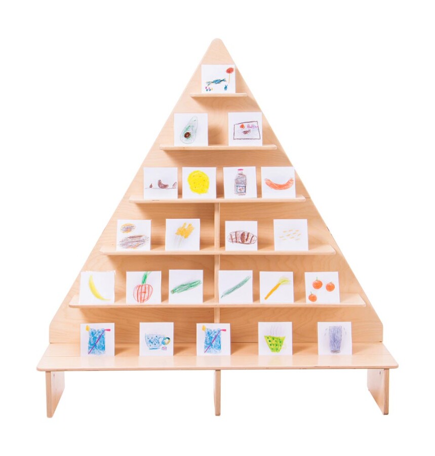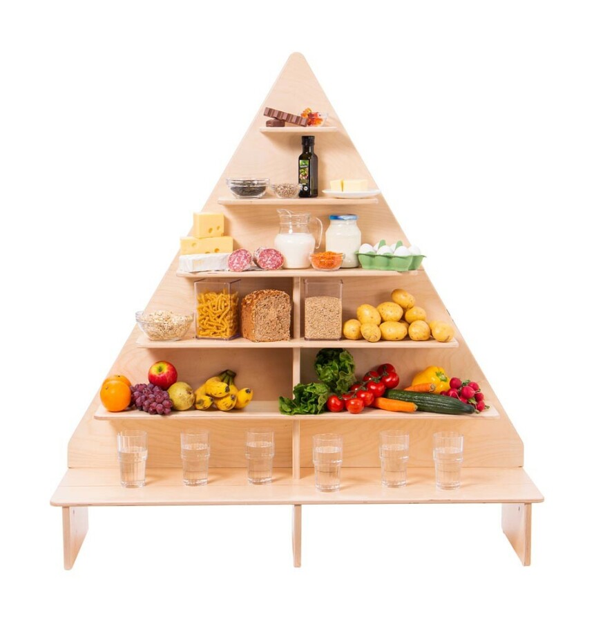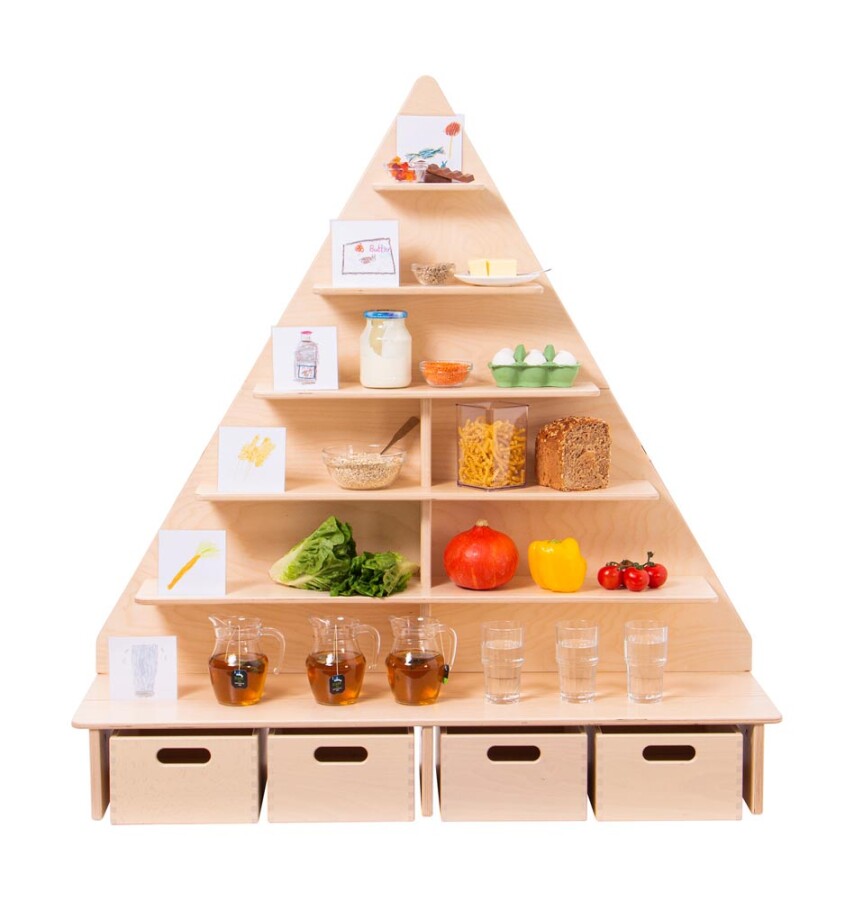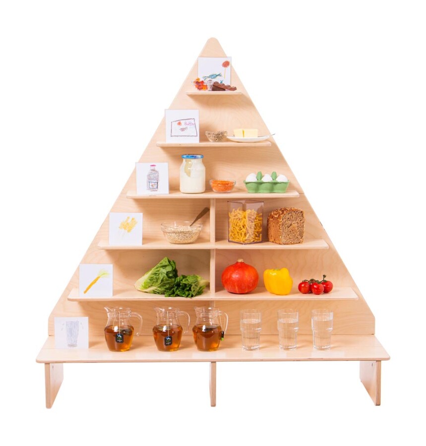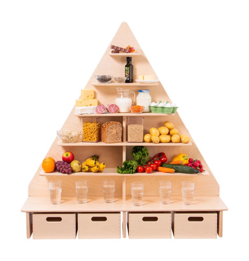 Met deze houten piramide bespreek je spelenderwijs gezonde keuzes en verhoudingen tussen voedselgroepen. De zes lagen geven duidelijk aan wat vaak kan en wat af en toe hoort. Laat kinderen echte producten indelen, vergelijken en erover praten. Samen ordenen, bereiden en delen versterkt groepsgevoel en taal.