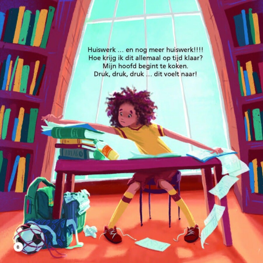 Evi heeft haar handen vol aan school, huiswerk, vrienden, familie, hobby’s, sport en haar huisdier. Ze heeft stress omdat ze eigenlijk overal net te weinig tijd voor heeft. Als ze het gevoel heeft dat ze gaat ontploffen, vraagt ze hulp aan haar moeder. Zij neemt Evi mee naar buiten, leert haar trucjes om rustig te worden, geeft tips om beter met stress om te leren gaan en leert Evi om al haar taken goed in te plannen. Daarna gaat alles veel beter! Evi heeft het nog steeds druk, maar ze heeft geen stress meer en heeft weer plezier in de dingen die ze doet!