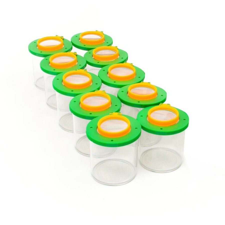 Voor groepjes werken ideaal: een set potjes met loepdeksel voor elke kleine onderzoeker. Elk potje vergroot 2x of 4x met de dubbele lens. Stevig kunststof en een schroefdeksel zorgen voor zorgeloos gebruik. Handzaam en licht, dus makkelijk mee naar buiten. Bodemraster maakt tellen en maatvergelijkingen eenvoudig in de les.