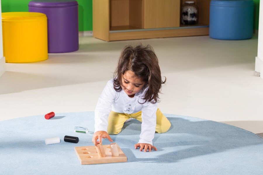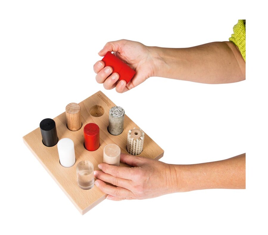 Een stevig insteekbord met voel-elementen prikkelt zintuigen en fijne motoriek. Kinderen grijpen, vergelijken en benoemen verschillende materialen, gewichten en structuren. Ideaal voor rustig onderzoek en taalrijk spel aan tafel.